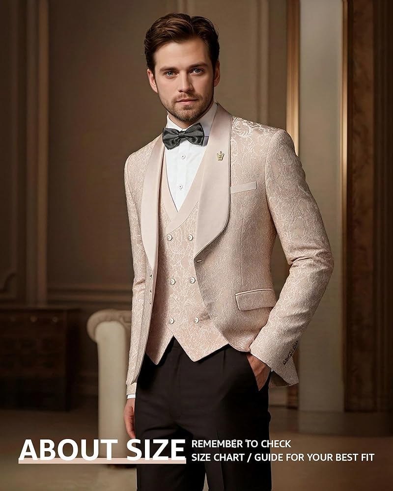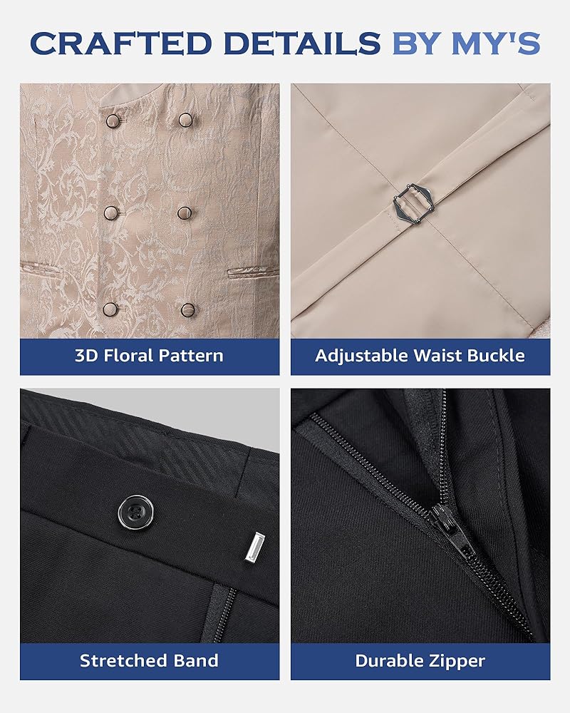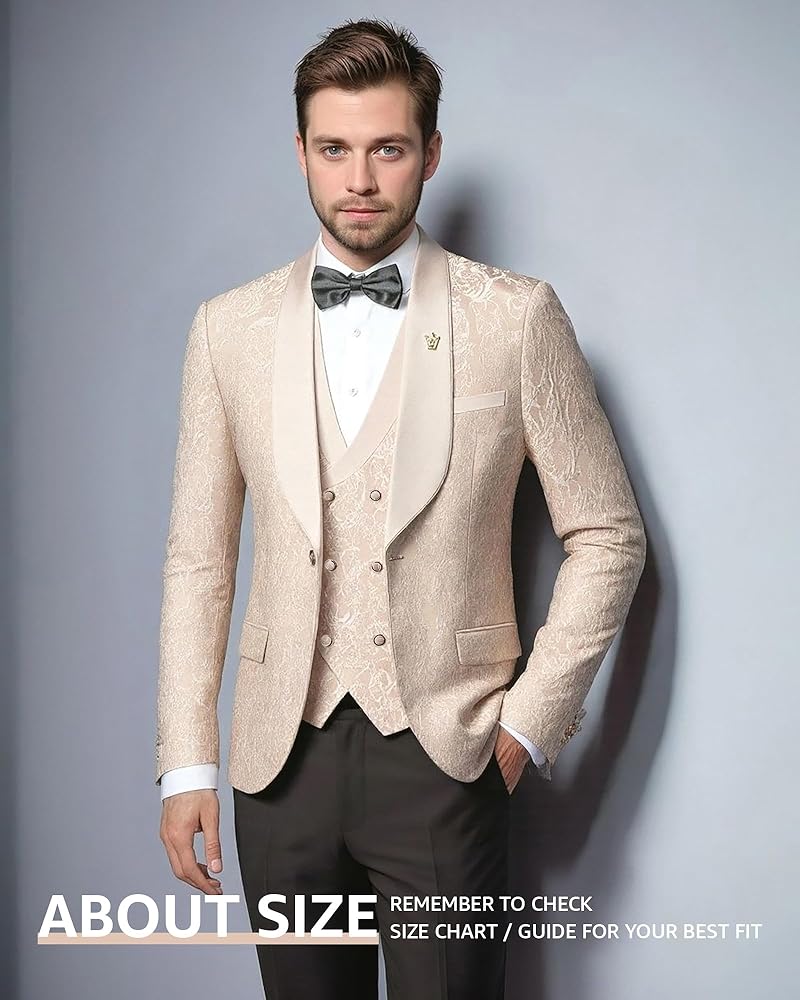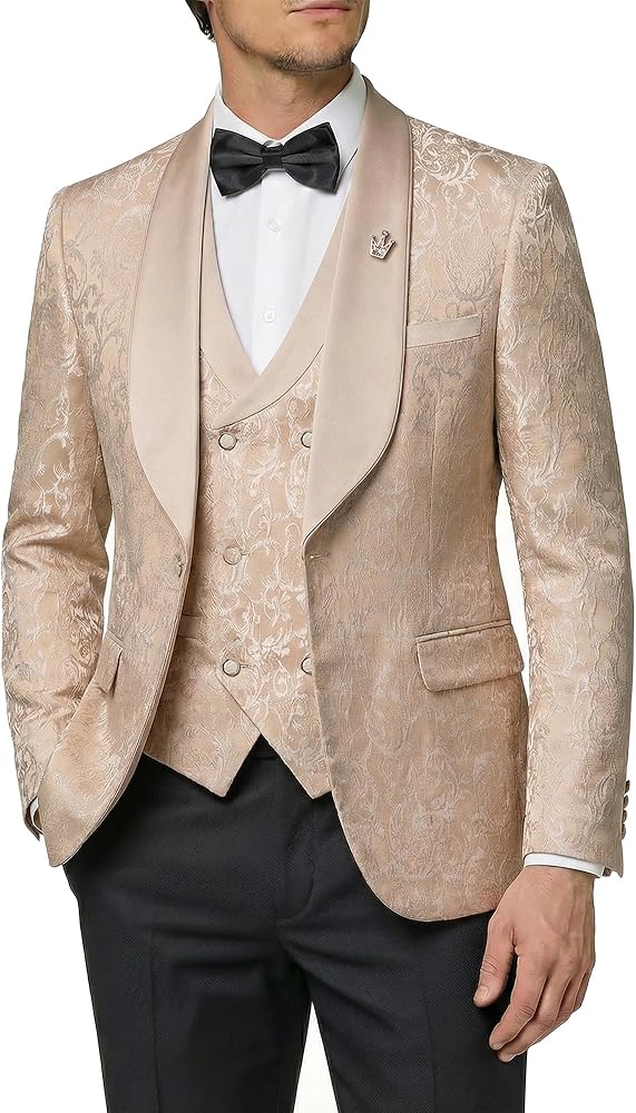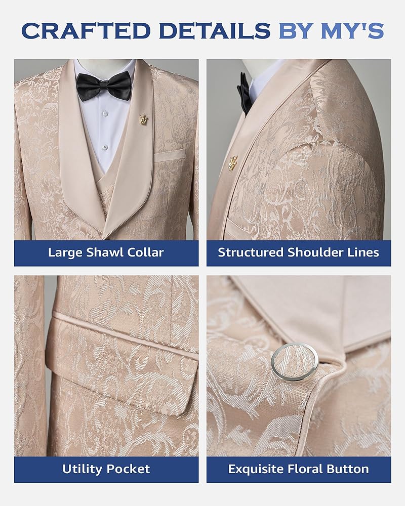 MY'S - MAN YOU'LL SUCCEED: Features a shawl lapel blazer with 1-button closure, 4-button cuffs, and multiple pockets. The jacquard floral pattern adds a shiny, unique touch to the jacket and vest. Comes with black trousers and a bow tie for a refined look