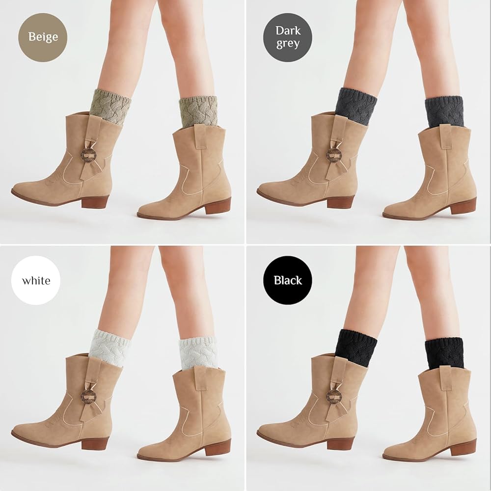 Various Collocation: The short leg warmer socks are available in 4 colors for you to choose from. Can casually dress it up with clothes and heeled booties, mid-calf wedgies, bare legs and sky high stilettos. It slides onto the top of the boot, and you can wear the crochet boot cuffs over bare legs, skinny jeans, tights or leggings without any bulk in your boots. Whether it is knee-high boots or ankle boots, leg warmers can achieve the double effect of fashion and warmth.