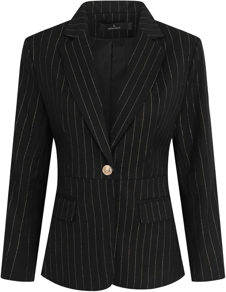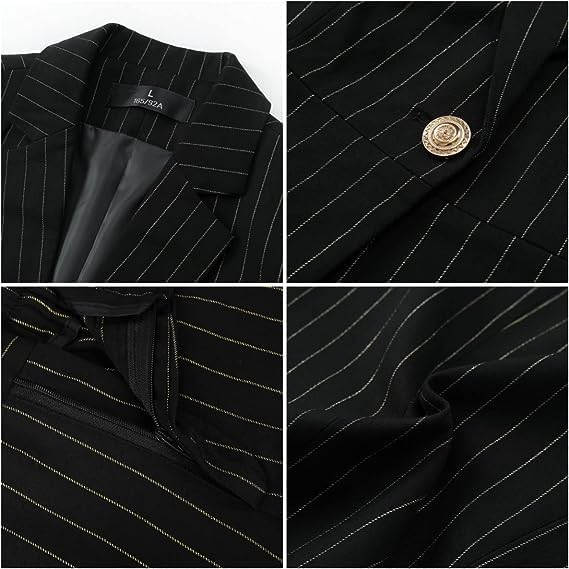 Blazer: Gold striped suit set, notched lapel, one button, both blazer and pants have 2 pockets. You can carry many things when you go out, such as phones, keys, etc