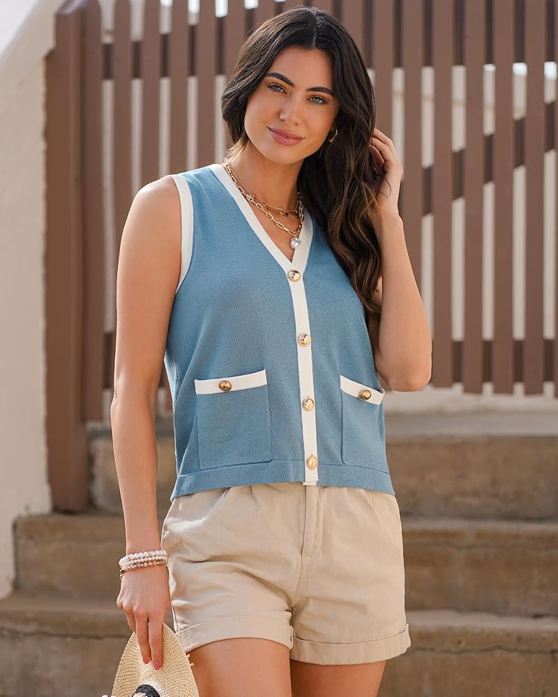 Featuring a trendy colorblock detailing and a sleeveless design, knit vest adds a playful yet sophisticated touch to your casual outfits