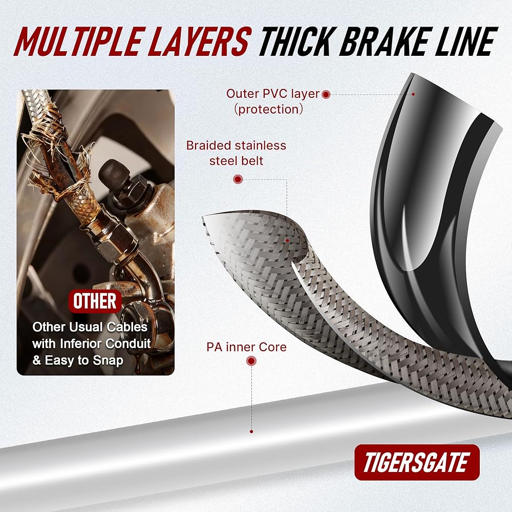 👍Quality You Can Trust: Our stainless steel braided brake line with black vinyl coating won't cause any damage to the areas where the cable touches. Durable inner wire can also ensure the whole cable has a longer life and better performance when using