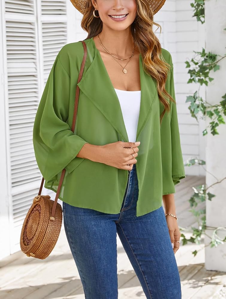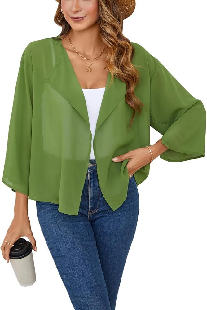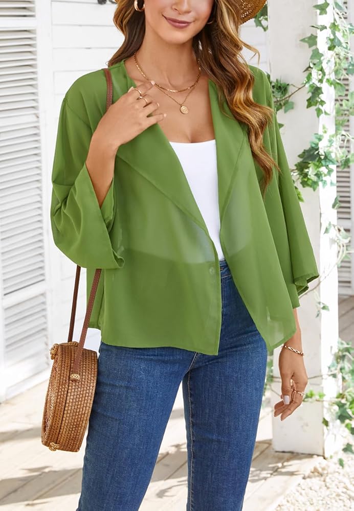 Feature: Women short chiffon cardigan, 3/4 slit sleeve shrug, open front kimono, short bolero, solid color, flattering, casual and lightweight top for women; This short shirt is suitable for all year round; Pretty coverage for upper arms or low cut dresses