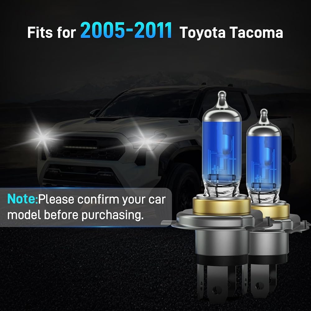 WIDE COMPATIBILITY: Compatible with toyota tacoma 2005 2006 2007 2008 2009 2010 2011 all models. This tacoma halogen headlight bulbs kit includes 2 pieces bulbs for tacoma high low beam