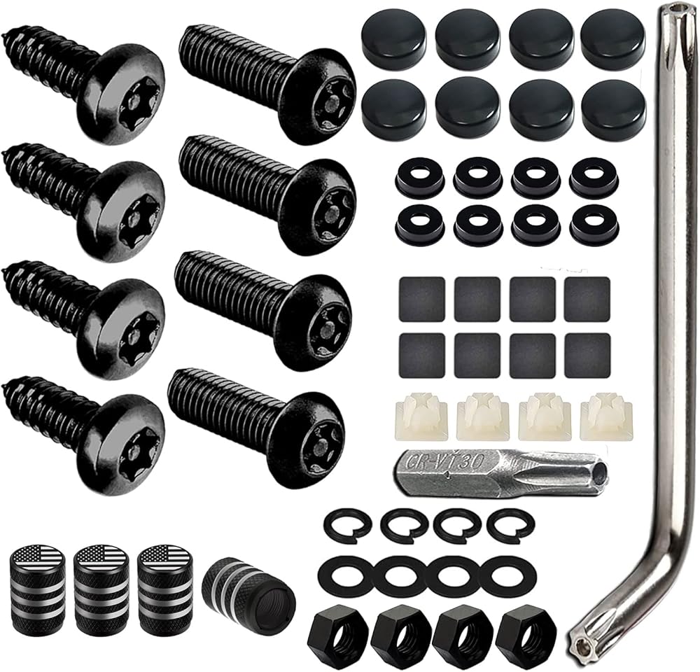 🚗 Package Contents: 4 x Self Tapping Screws, 4 Machine Screws, 8 License Plate Screw Caps, 2 x Tool Wrench, 4 Nylon Inserts, 4 Nuts, 8 x License Plate Gaskets (Spacers), 4 Car Wheel Valve Caps . License plate screw kits protect your car and decorate your car.