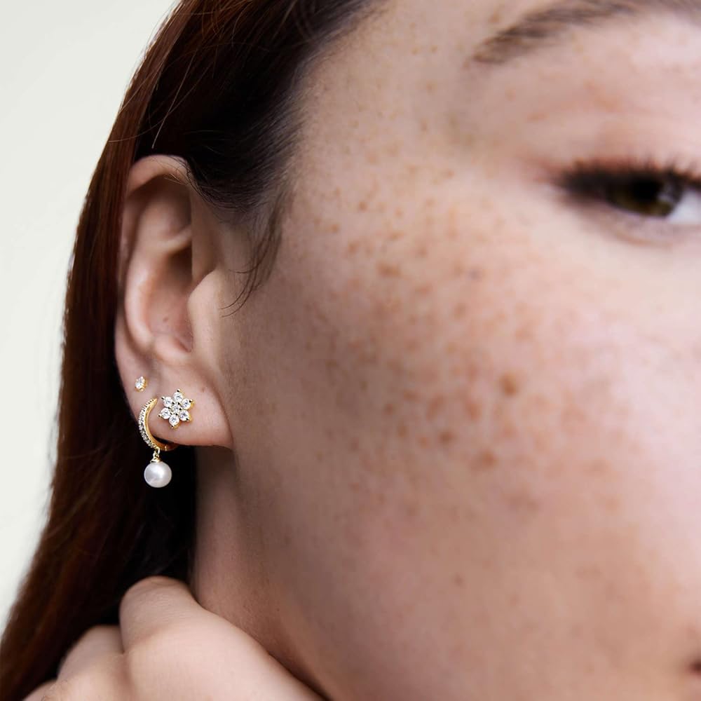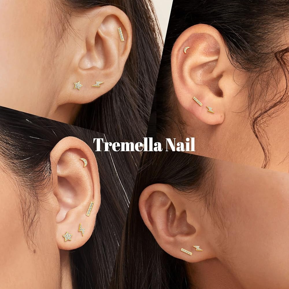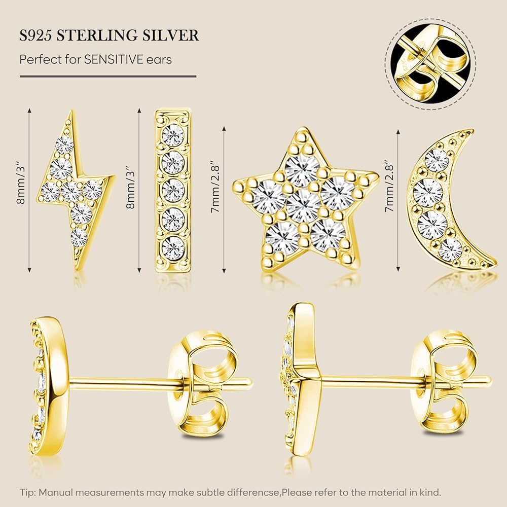 Earring Sets for Multiple Piercing: Sterling Silver earrings for women,includes 4 pairs of stud earrings for women.(Flat 8mm, Lightning 8mm, Moon: 7mm, Star earrings 7mm)The sizes vary just slightly so they can be worn coordinating in multiple piercings or on their own.