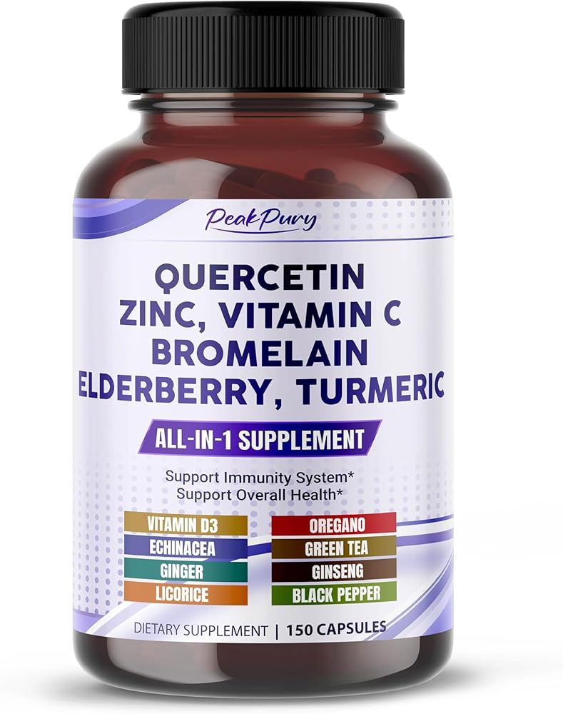 PeakPury Quercetin contains 14 potent herbs: Vitamin D3, Zinc, Vitamin C, Quercetin, Elderberry, Turmeric, Bromelain, Echinacea, Ginger, Licorice, Ginseng, Oregano, Green Tea, and Black Pepper.