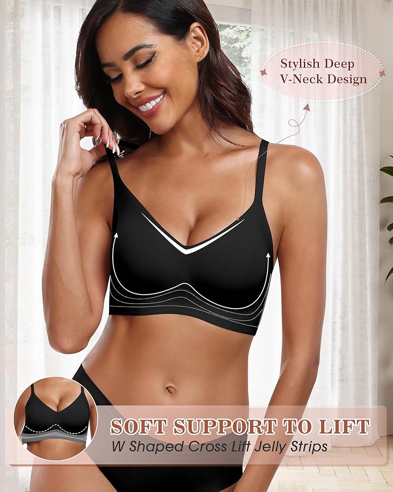 【Super Comfortable & Seamless Fit】Our everyday bra fabric is buttery soft, has a smooth material that conforms to the body's curves, and keeps you dry and comfortable all day. The plunge bra is soft and breathable, light as a cloud, and feels nonrestrictive while supporting. And the hem of wireless bras for women won't roll or move up, so you can move more freely.
