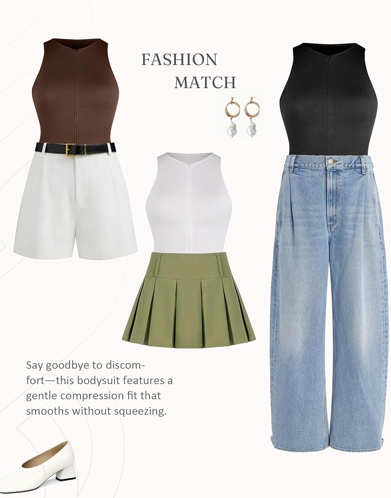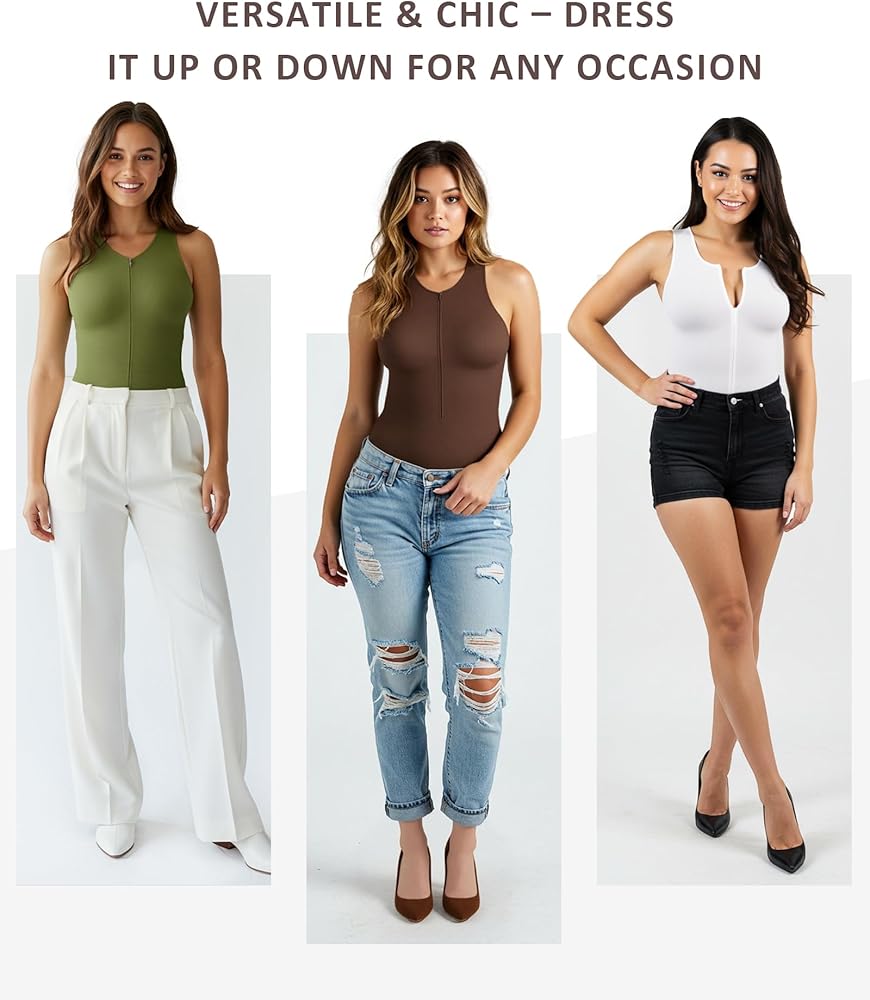Versatile Neckline: Whether you're dressing up for a night out or keeping it casual during the day, the front zipper design allows you to adjust your neckline to match your style. Zip it up for a sleek, polished look or unzip for a more relaxed and effortlessly chic vibe. This bodysuit for women transitions seamlessly from sophisticated to bold, giving you the freedom to express yourself.