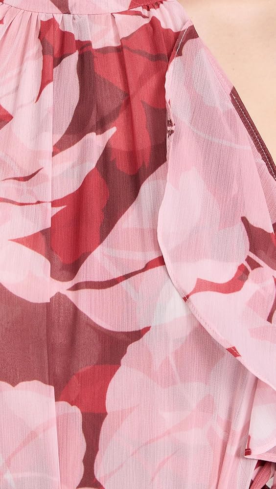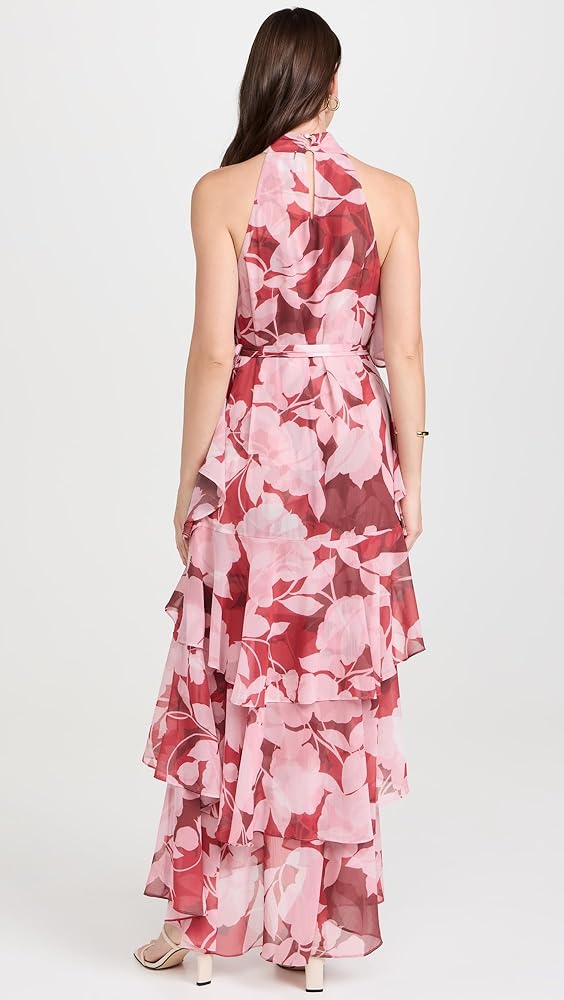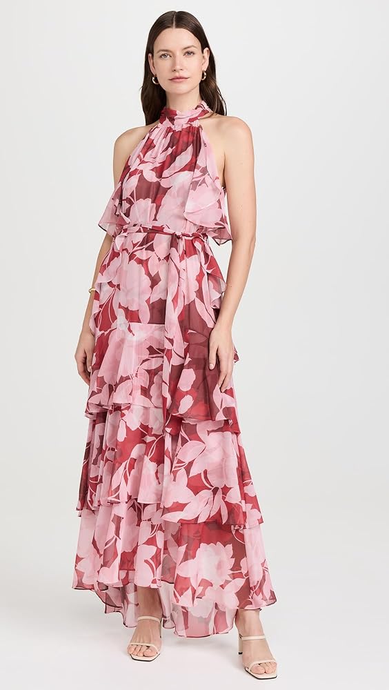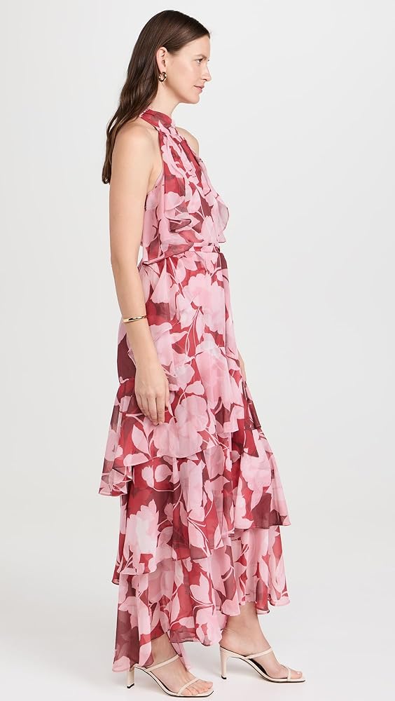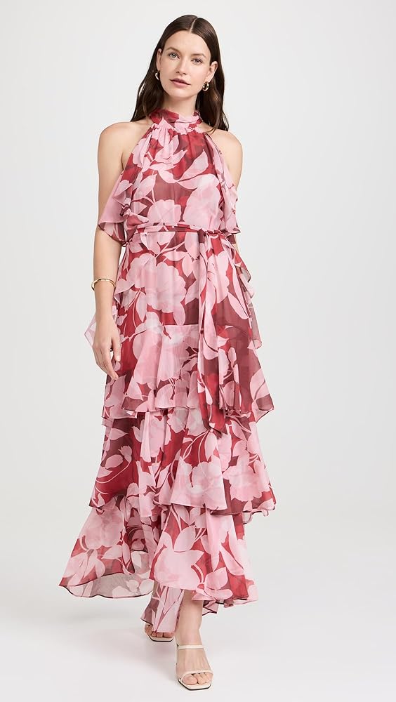 - Floral pattern, Tiered ruffle skirt, Cascading ruffles at sides