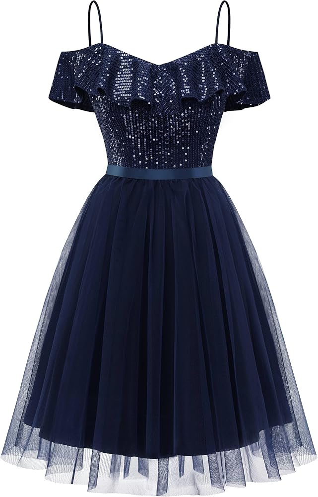 【Sparkly Sequin Dress】Adjustable Spaghetti Straps, Ruffle Shoulder, Lightweight Tulle, Hidden Zipper, Knee Length. Off shoulder design highlights the curves of your clavicle and arms, makes you more sexy and attractive.