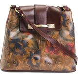 Embossed design, metal feet, dual top carry handles, gold tone hardware, debossed brand logo detail 12in W x 10in H Flap and magnetic disc closure 2 interior zip pockets, 2 interior slip pockets, 1 exterior zip pocket Leather