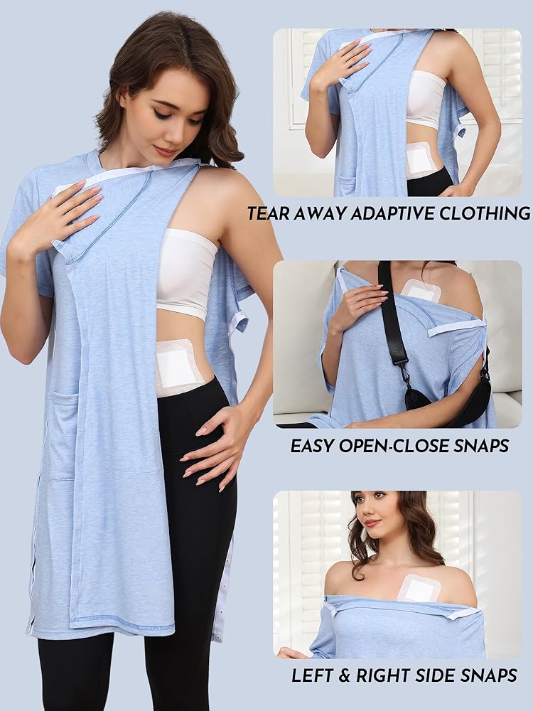 Tear Away Dress Design:Designed for post-shoulder surgery, rotator cuff recovery, and post-operative rehabilitation, this tear-away dress features full side snaps on sleeves, shoulders, and torso for easy access during medical examinations. The open design allows doctors to monitor injuries without removing the garment, while maintaining dignity and comfort for chemo patients, elderly, or those with limited mobility.