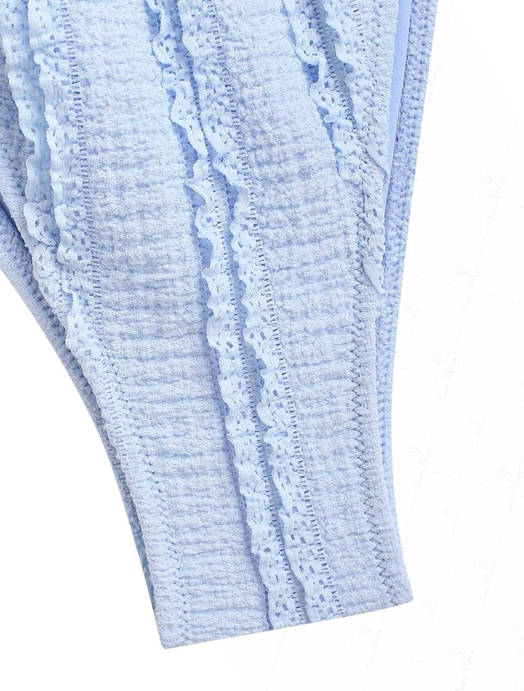 This Seamoly tankini set features stylish ruffles and textured embellishments, combined with a solid color pattern for a chic and elegant beach look.