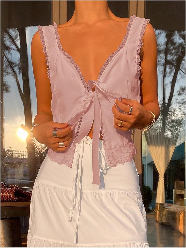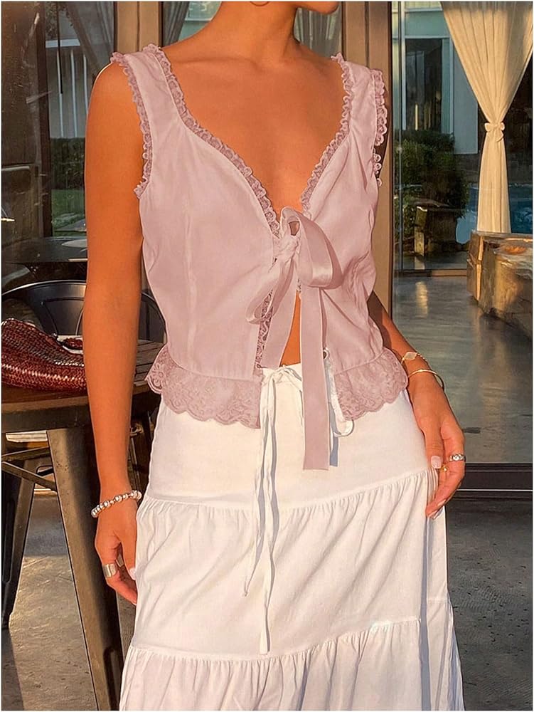 - Features: Contrast lace, tie front, v neck, sleeveless, womens tops, y2k tops, fashionable
