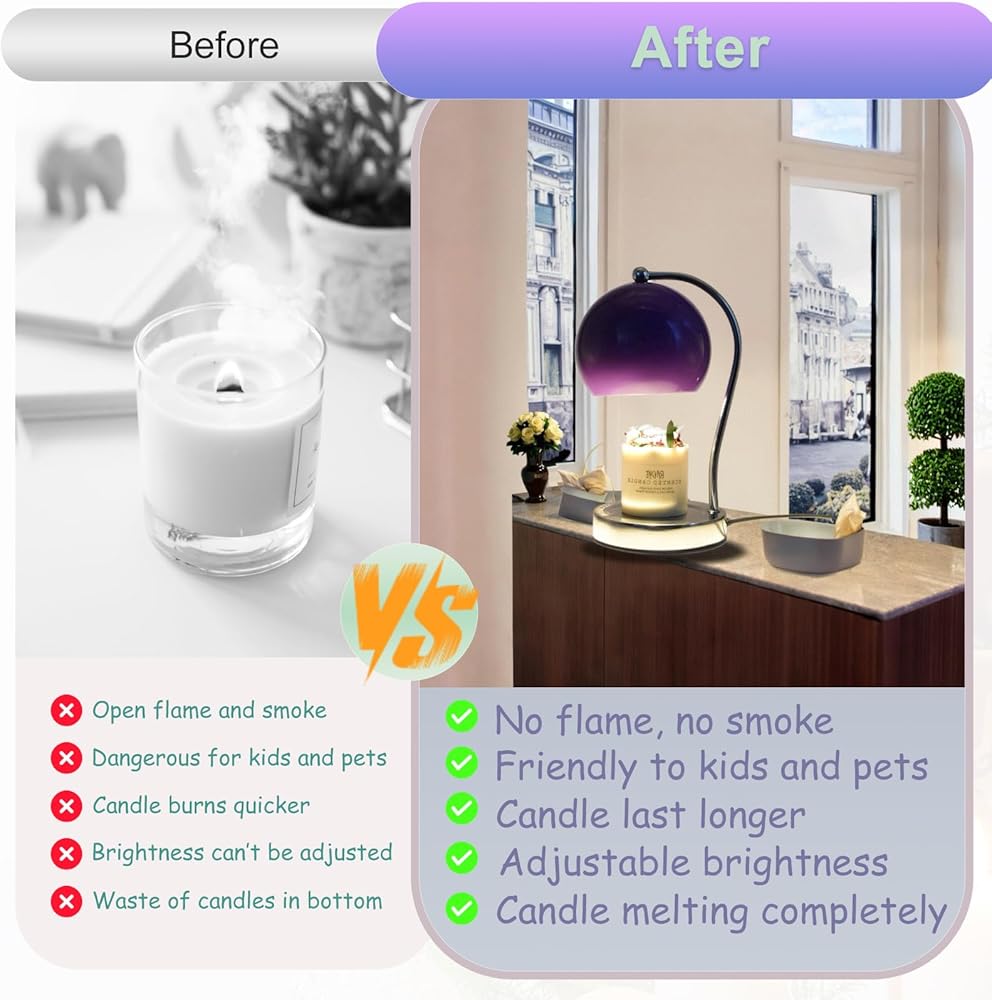 【Safe and Efficient Candle Warming】Say goodbye to traditional candle holders and hello to our modern candle warmer lamp. Designed with safety in mind, it provides a secure and stable platform for your favorite scented candles. The wax warmer lamp gently warms the candles from below, it wafts through the air, filling your space with your favorite candle scent but without the potential drama of an open flame. Thanks to the absence of an open flame, it's much safer to use around little ones and furry friends.