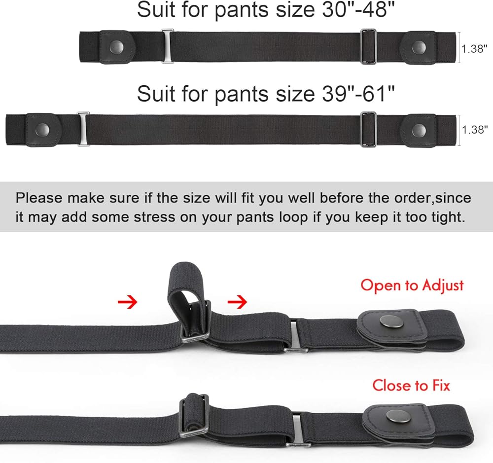 • Adjustable Size- S: Pants Size 30”-48”,L:Pants Size 39”-61”. If you are not sure about the size, go bigger. If it's too large or small for you,just adjust it by sliding the metal bar and you'll get the right size.Please make sure if the size range will fit you well before the order,since it may add some stress on your pants loop if you keep it too tight.