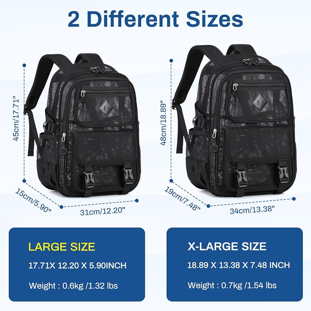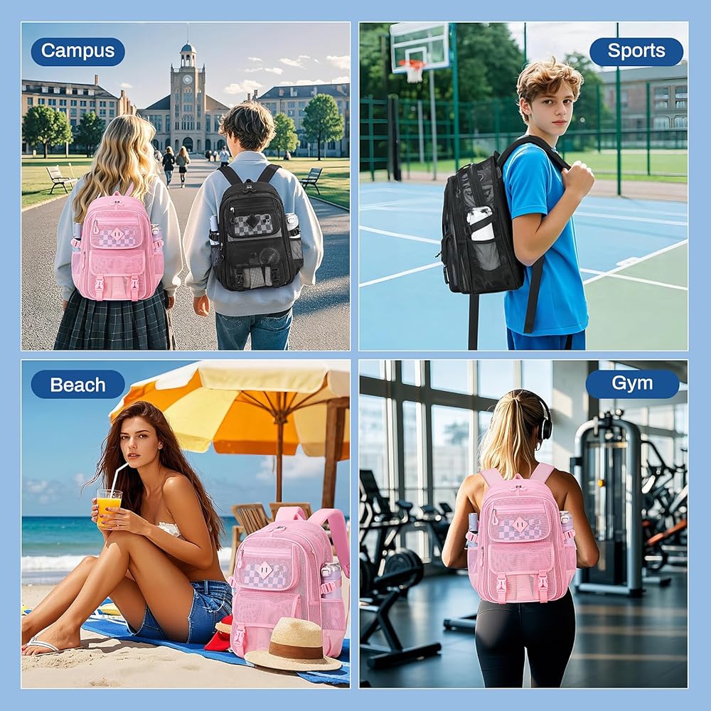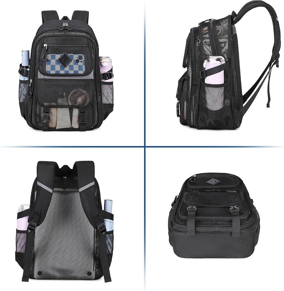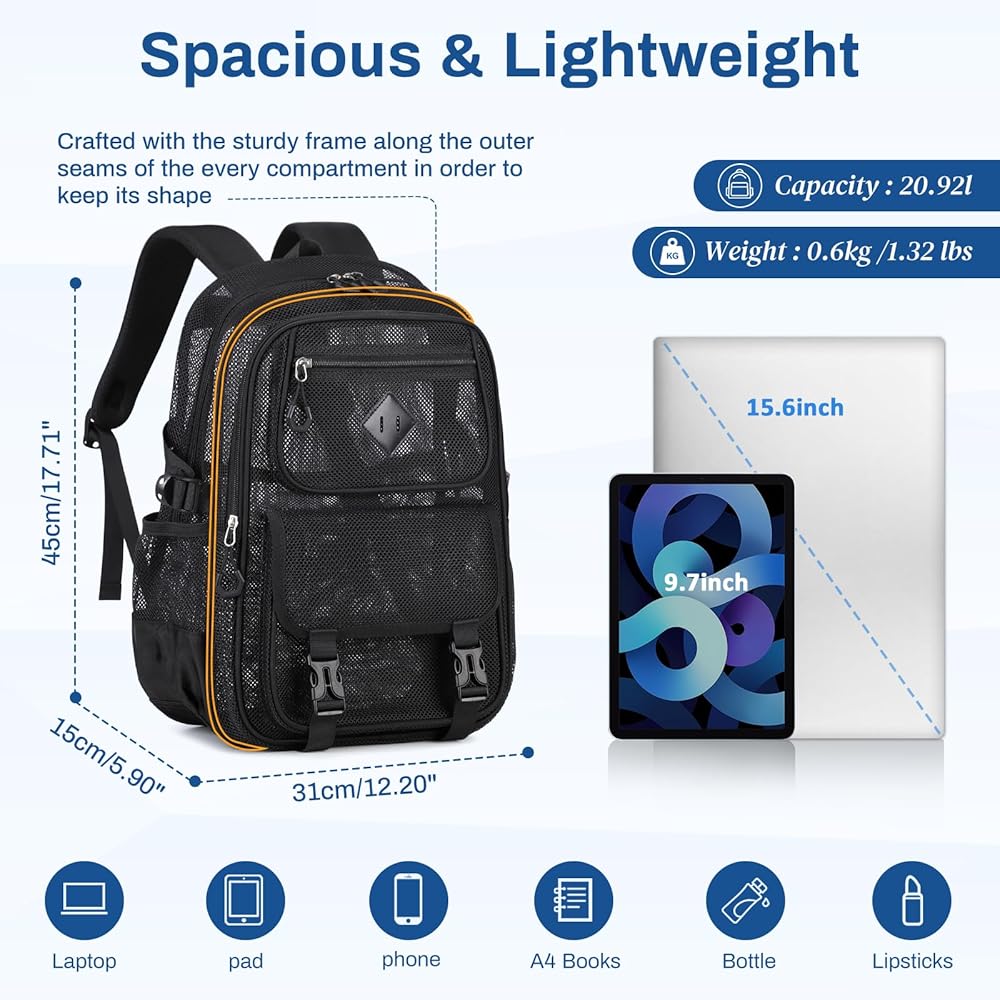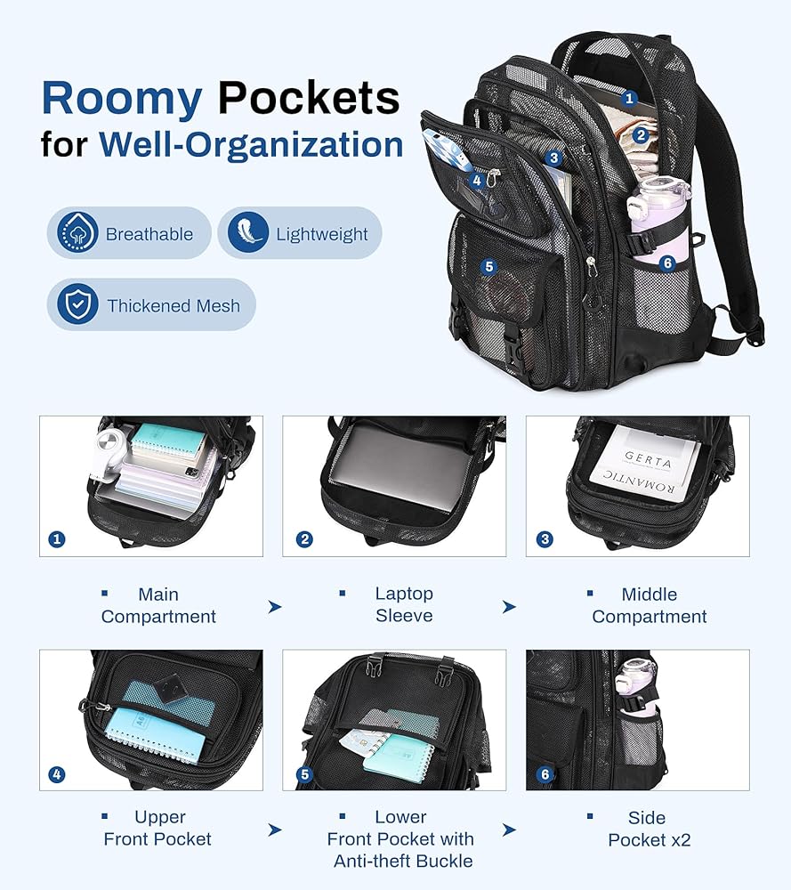 Roomy & Multiple Pocket: Main compartment with Laptop Sleeve; Large Middle Pocket; Front Upper Pocket; Lower Front Pocket with Anti-theft Buckle; Elastic Side Pocket x2;Mesh Backpack is well-organized to storage of all your daily or school essentials