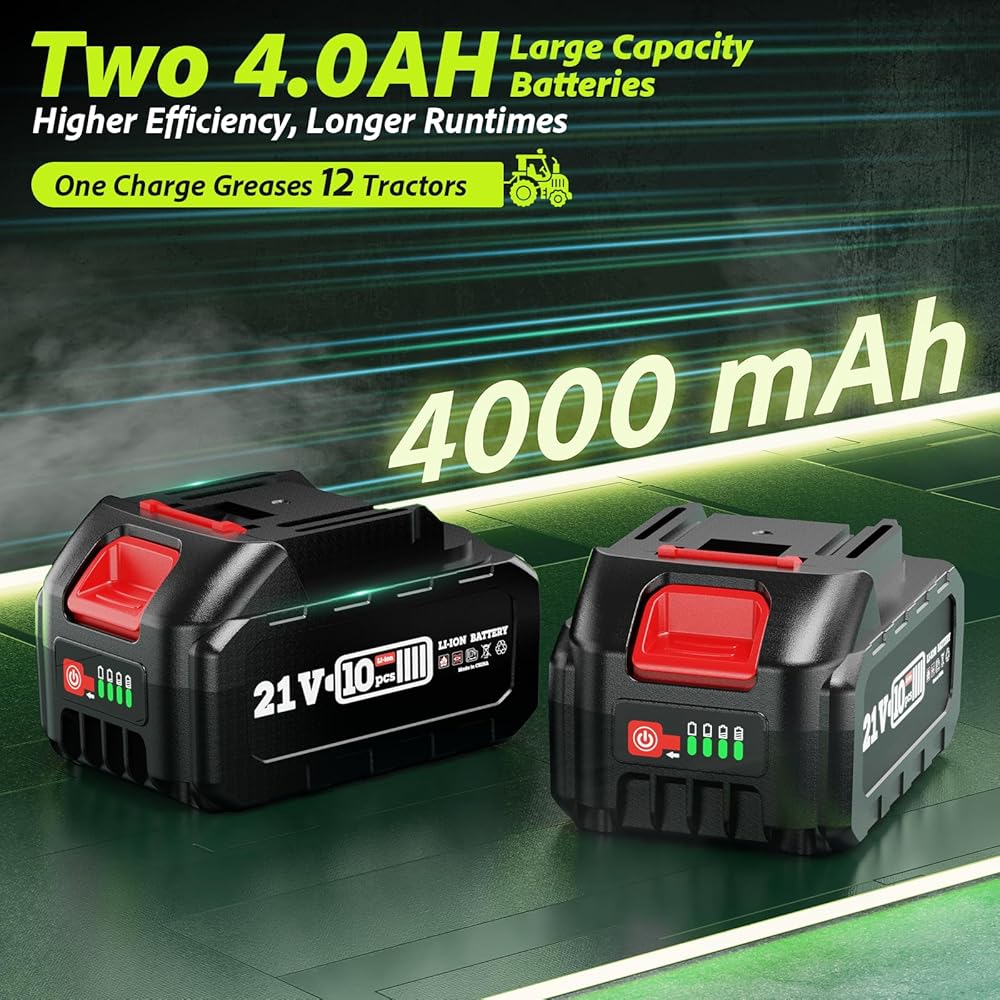 Long-Lasting Battery Power: Equipped with two 4000mAh batteries, this grease gun supports up to 12 tractors on a full charge. It's compatible with Ma-kita batteries for added flexibility and performance, making it an excellent choice for professionals. Extended battery life reduces downtime during outdoor work.