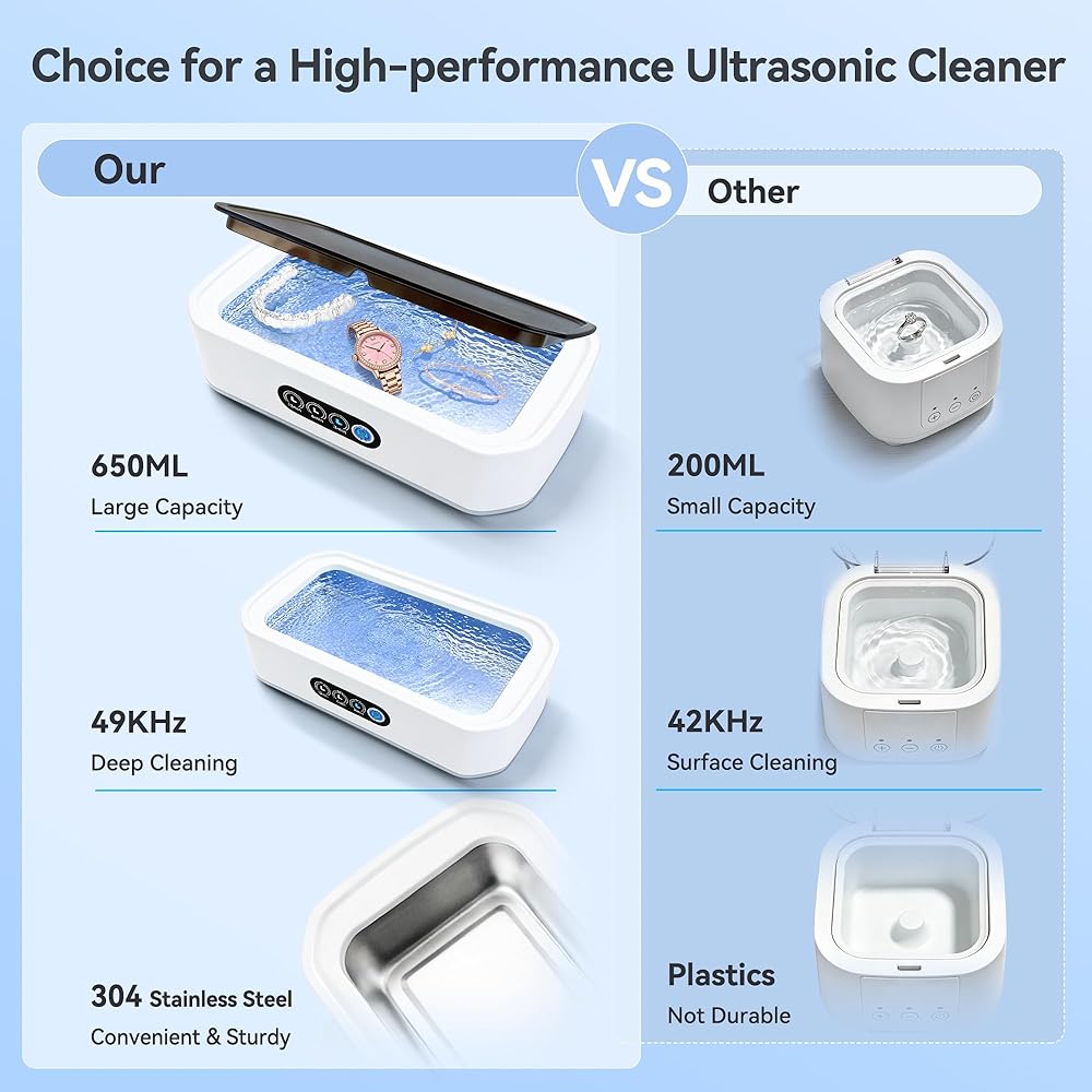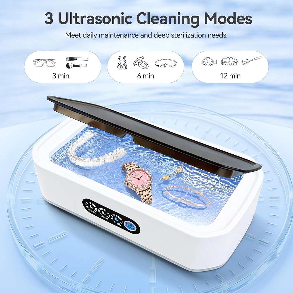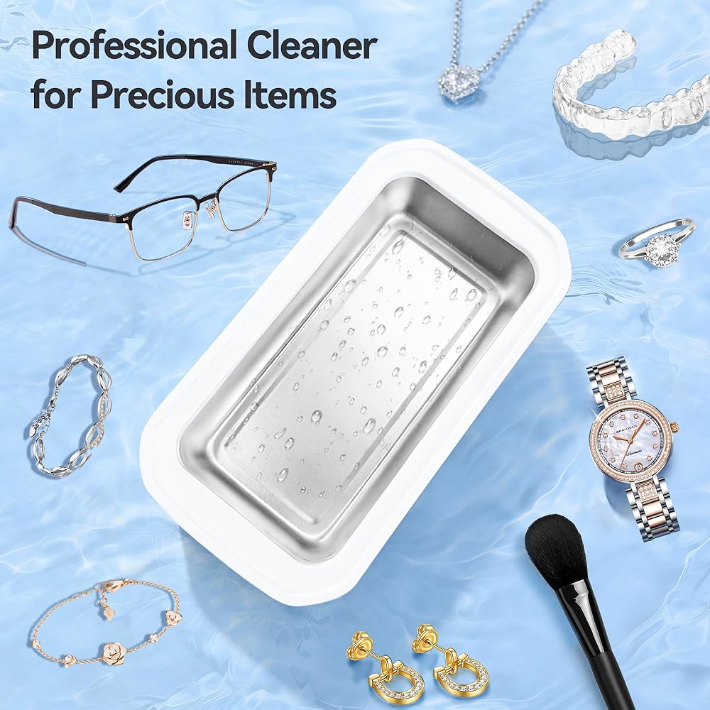 [MULTI-FUNCTIONAL JEWELRY CLEANER]: Ultrasonic cleaner uses 49,000Hz high-frequency ultrasonic waves to clean deeply items at 360°, restoring their original luster without damage. It can clean eyeglasses, jewelry, dentures, watch coins, etc.