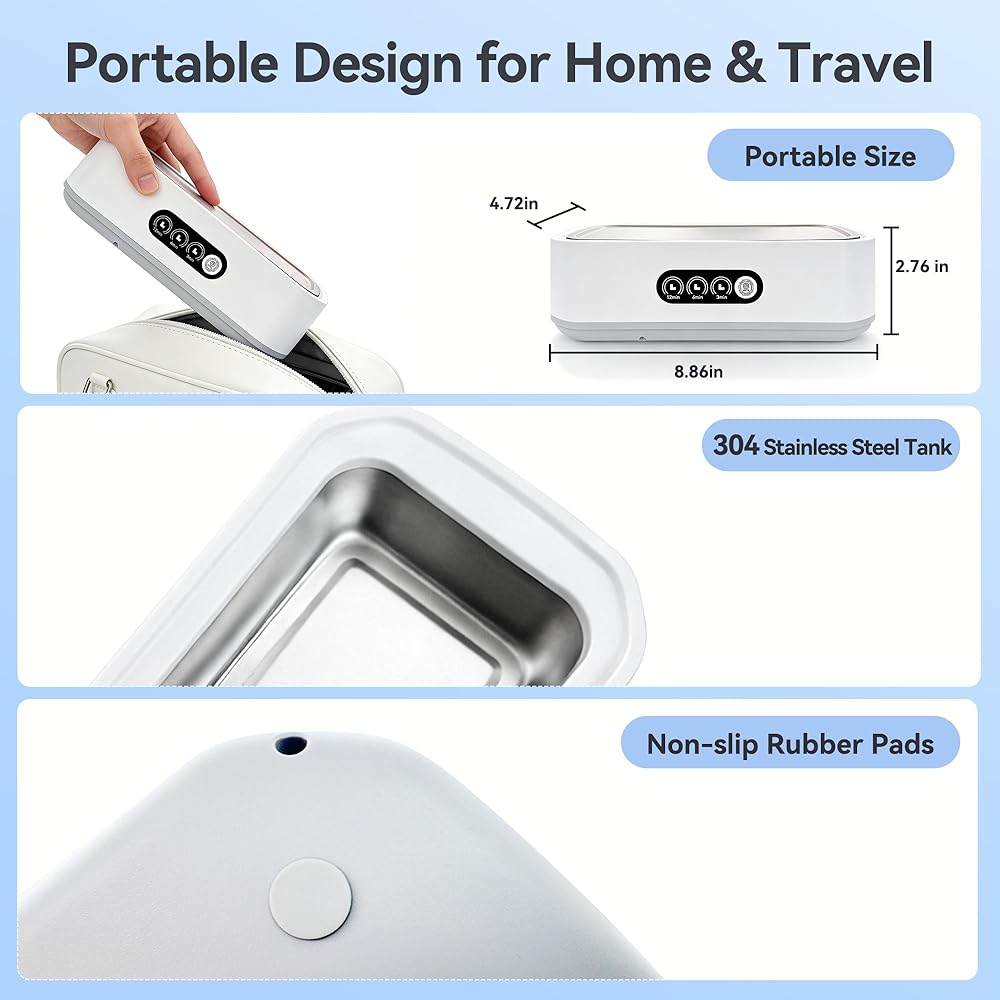 [CONVENIENT AND STURDY]: This lightweight and portable ultrasonic cleaner is made of high-quality stainless steel and waterproof coating, sturdy and durable, easy to be cleaned. The bottom is equipped with four non-slip rubber pads to stabilize the ultrasonic cleaner and effectively reduce noise.