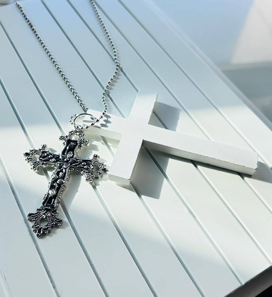 Material : The chain of this silvery cross necklace y2k is 14 inches long in a snake design and is made of 14K silver plated brass. The double cross charm pendant is encrusted with clear rhinestones and is hypoallergenic and resistant to fading and tarnishing