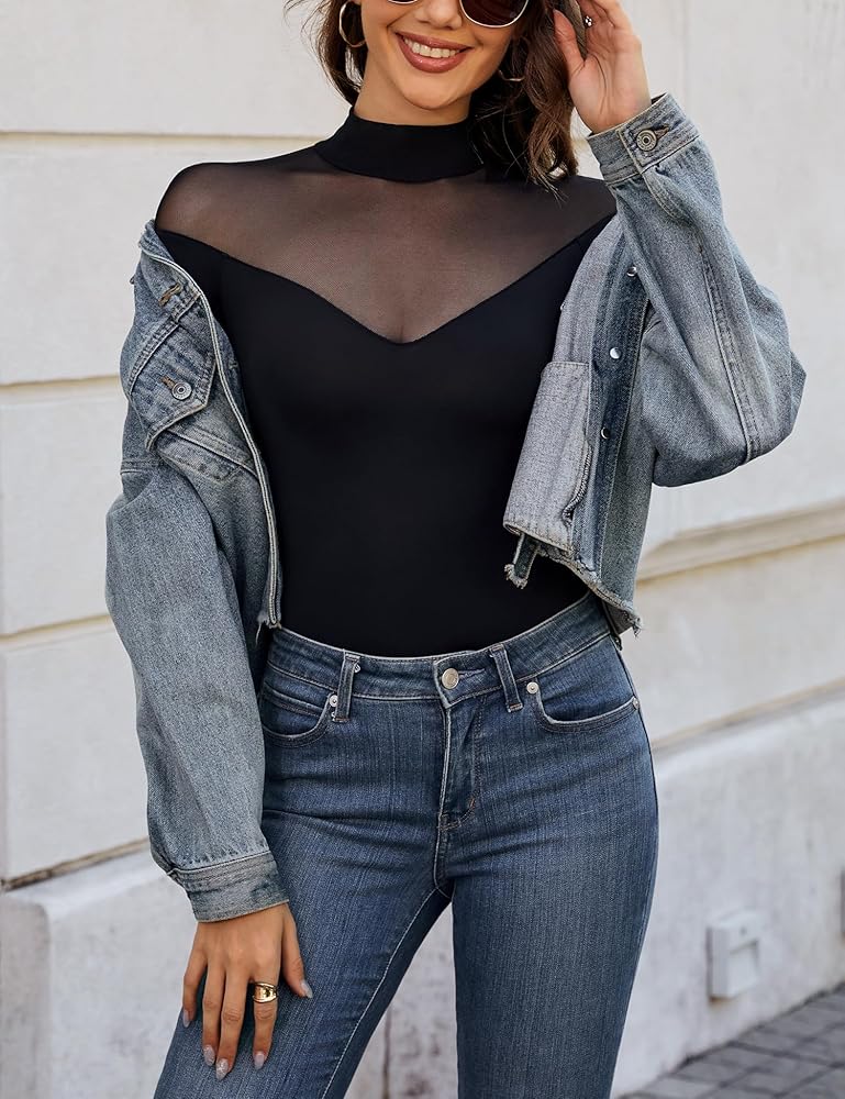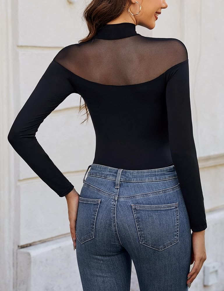 ❀ Classic Design: Mock turtle neck provides a chic and elegant look, it elongates the neck and enhance a sophistication touch for body suit. Contrast sheer mesh and geometric pattern, improve sexy and sense of mystery. The snap closure gives an easy way to fit.