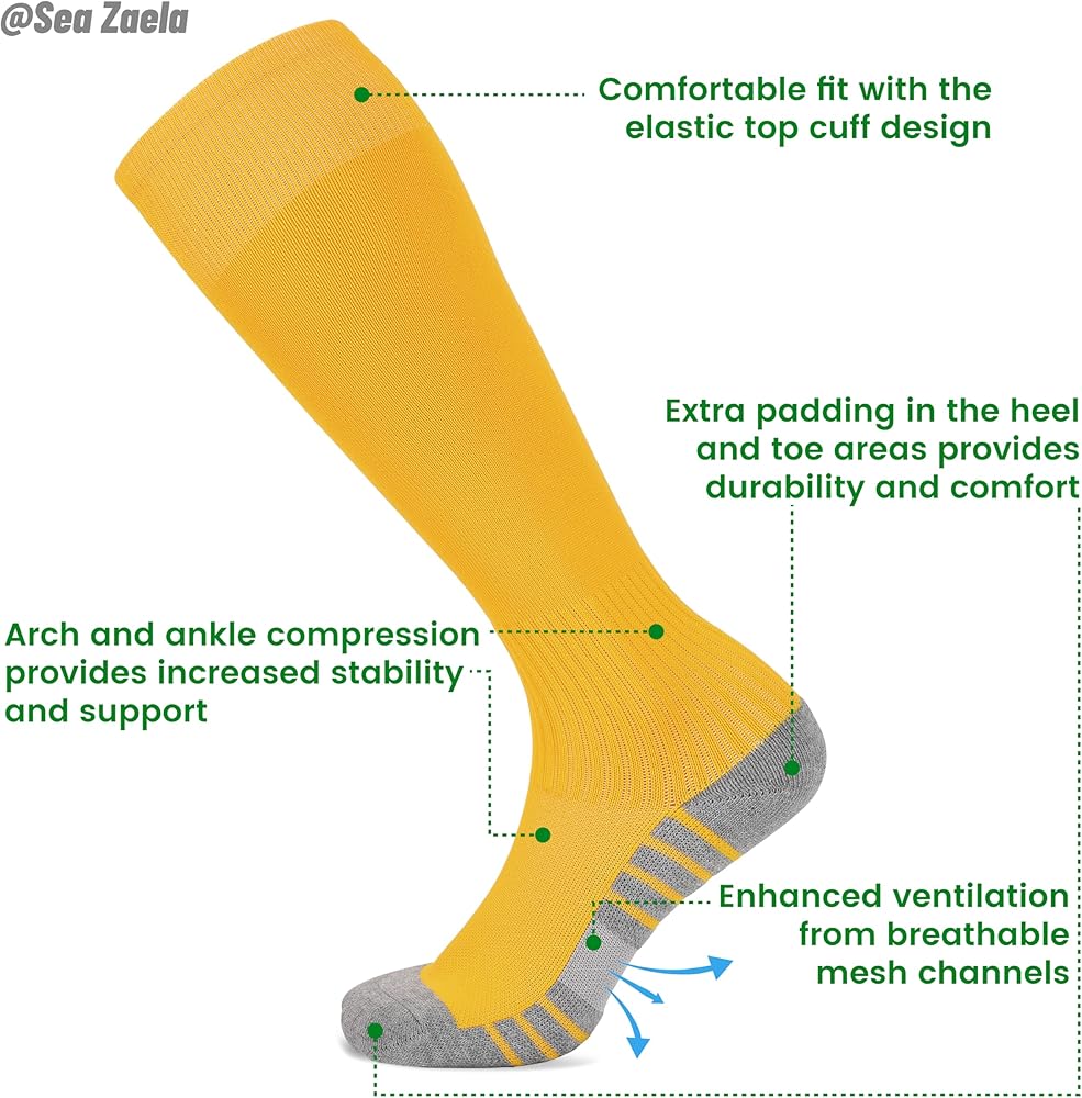 Breathable Design: Our youth and adult soccer socks feature a breathable fabric that keeps your feet cool and comfortable during intense matches, allowing for optimal performance on the field.