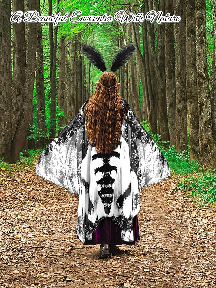 Easy to Wear: You just need to put the ring at the end of the moth cape on your finger, tie the adjustable shoulder strap around your neck, and then put on the feather headband and lace eye patch, which is lifelike and makes you look like a real moth butterfly
