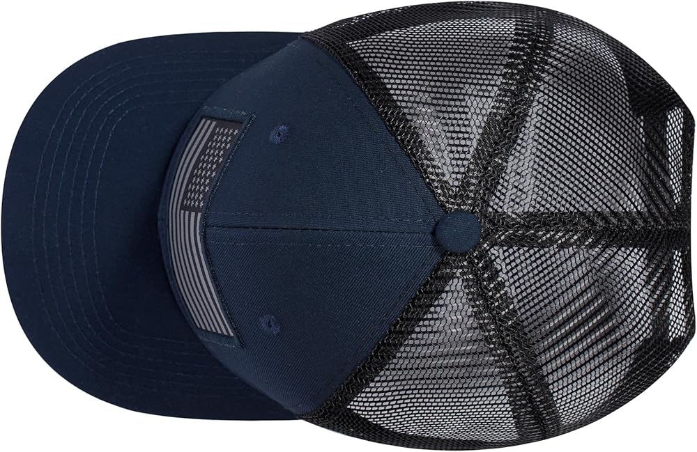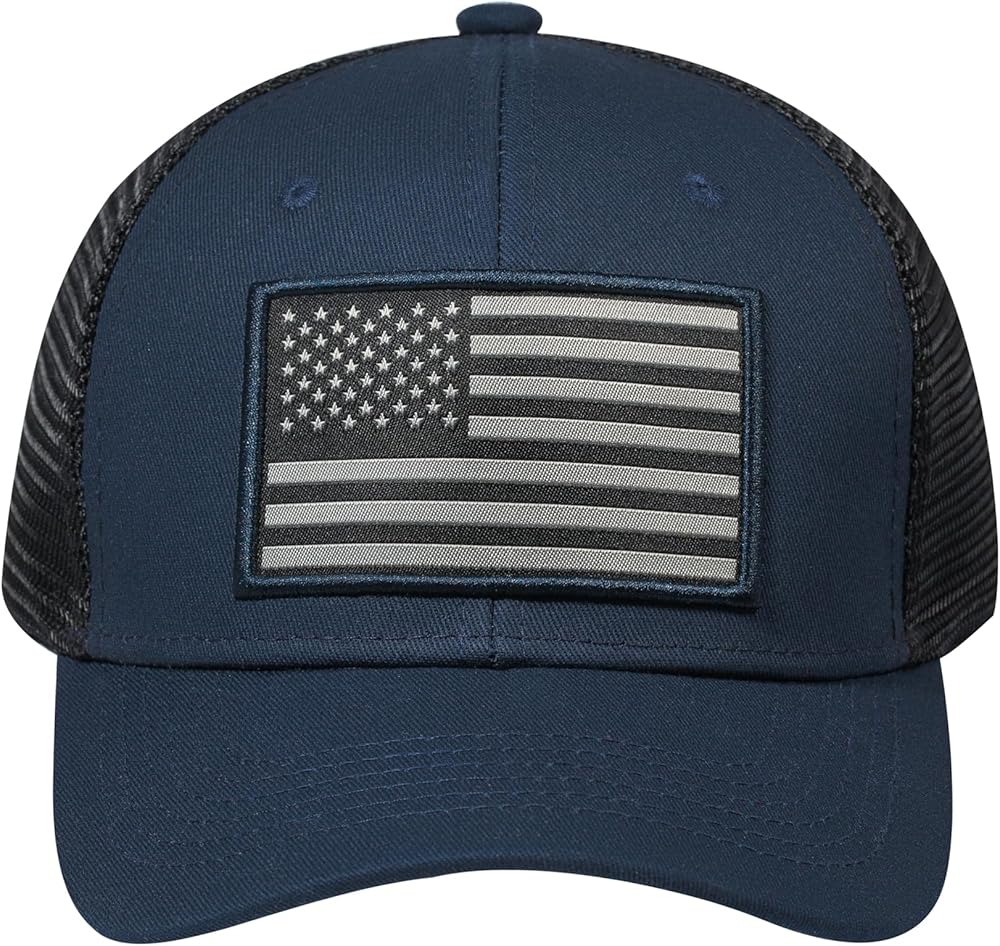Patriotic Trucker Hat For The Proud American: Prominent embroidered American flag patch prominently displayed on the front panel shows your national pride