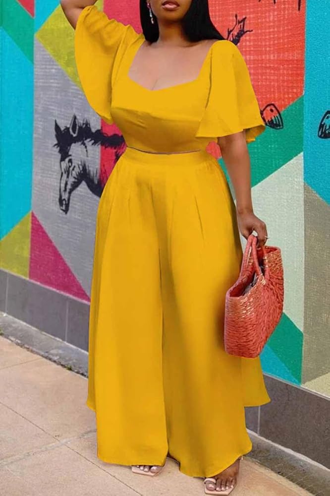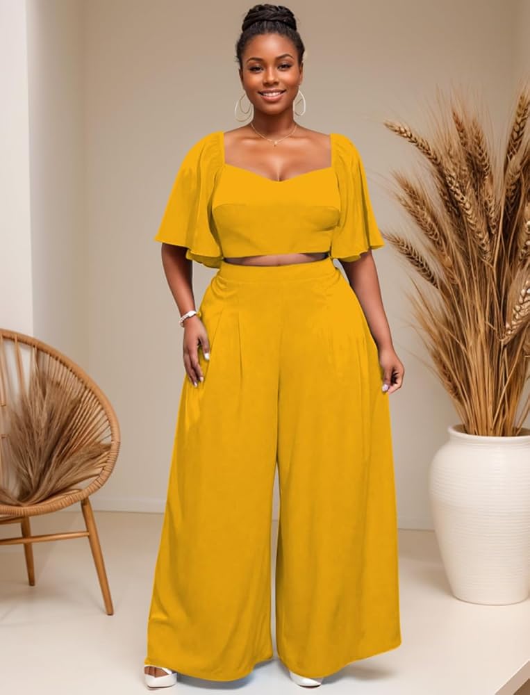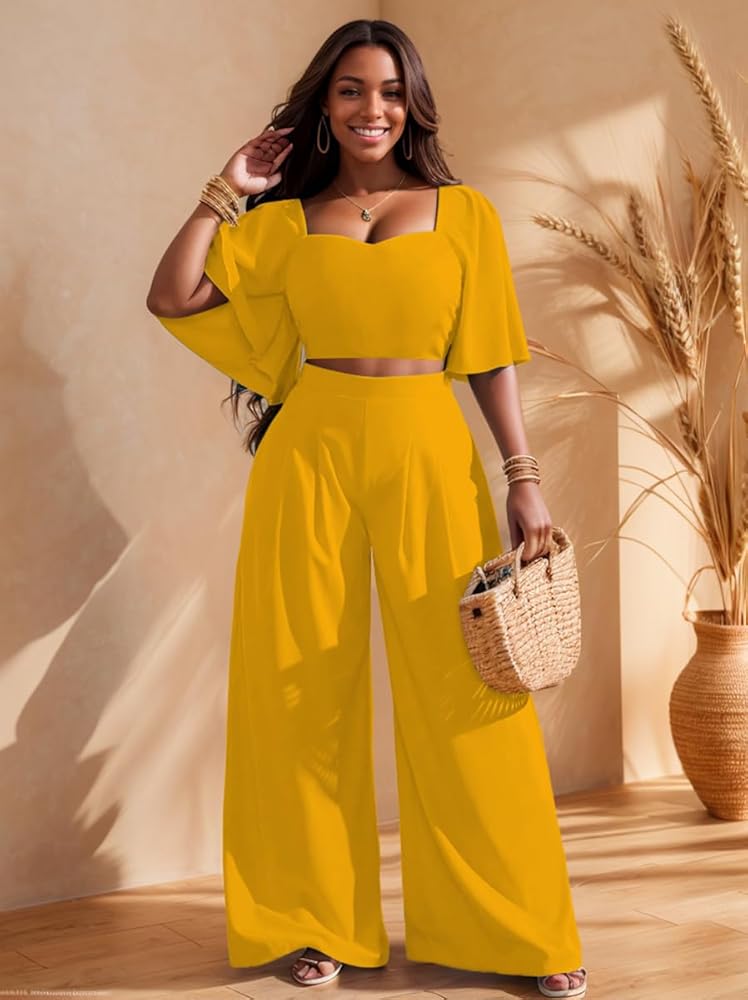 【FEATURES】 Crop top wide leg pants set for women, solid colors, sweetheart neck, casual ruffle short sleeve, loose swing flowy wide leg long pants, 2 piece pant outfits for women an indispensable casual trouser set for the modern women.