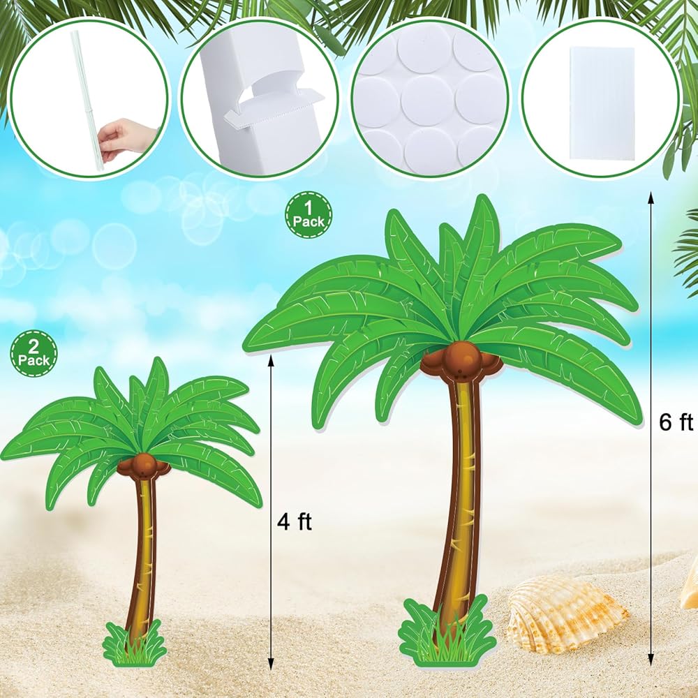 You will receive a summer palm tree stand up set, which includes two standing at 4 feet tall and one at 6 feet tall, and the assembly accessories include sticks, backboards, fixing glue, and round nano glue. While ensuring the integrity of the palm tree stand, we also provide a concise and easy-to-understand assembly instruction to ensure that you can smoothly assemble a delicated luau theme palm tree stand, transform your event into a tropical paradise instantly.