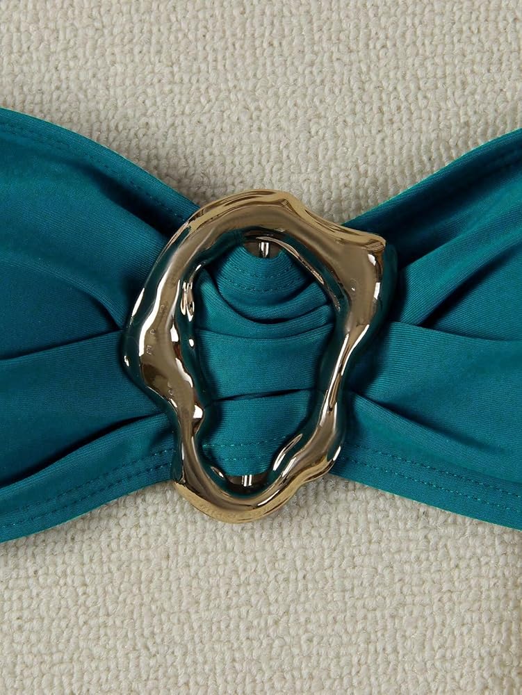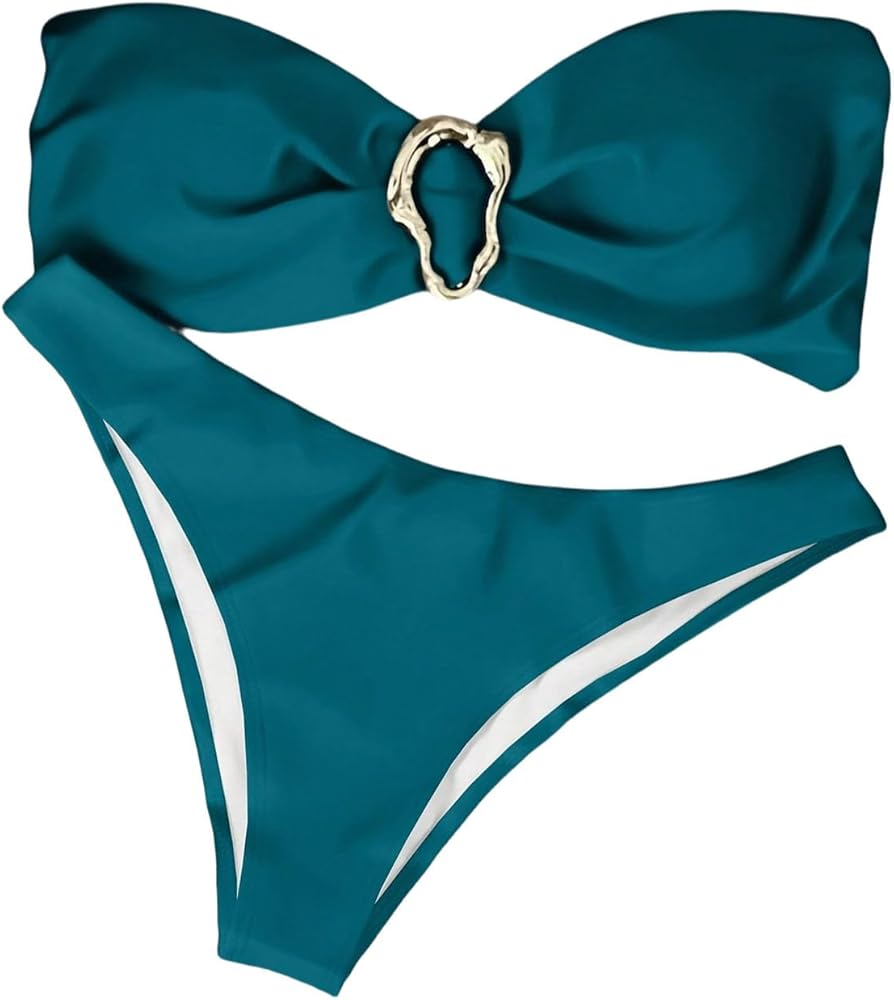 Features: 2 piece sets. The bikini top is ring linked, bandeau, strapless with tie at back design and removable padding, offering you a great support, enhancing your shape and bringing you closer fitting. The bikini bottom features a stylish high cut waist design for you, which brings you a sexy look with enduring comfort.