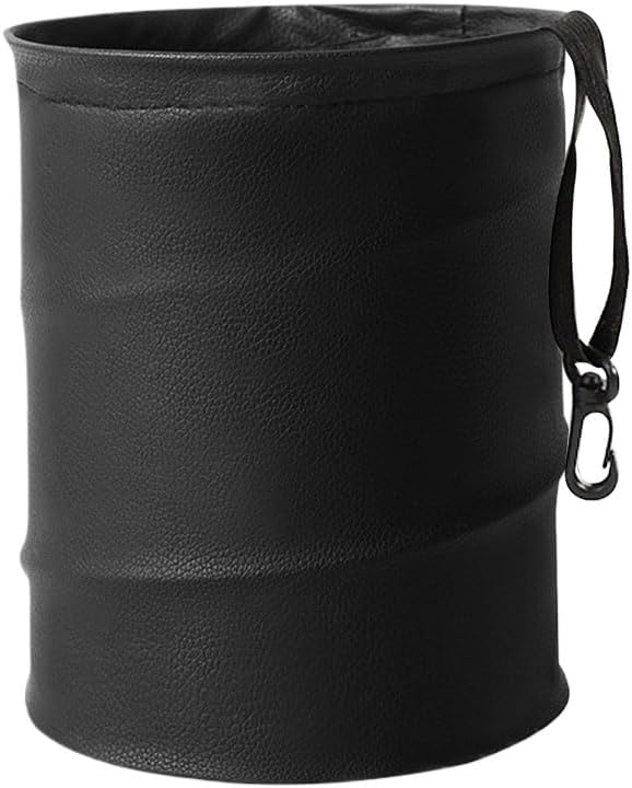 Collapsible Trash Can Car Garbage Bag - Leather Pop-up Car Trash Bin with Elastic Band - Hanging Foldable Garbage Can Vehicle Waste Basket Bin - Double-Layer Washable Bag for Cars Camping (Black)