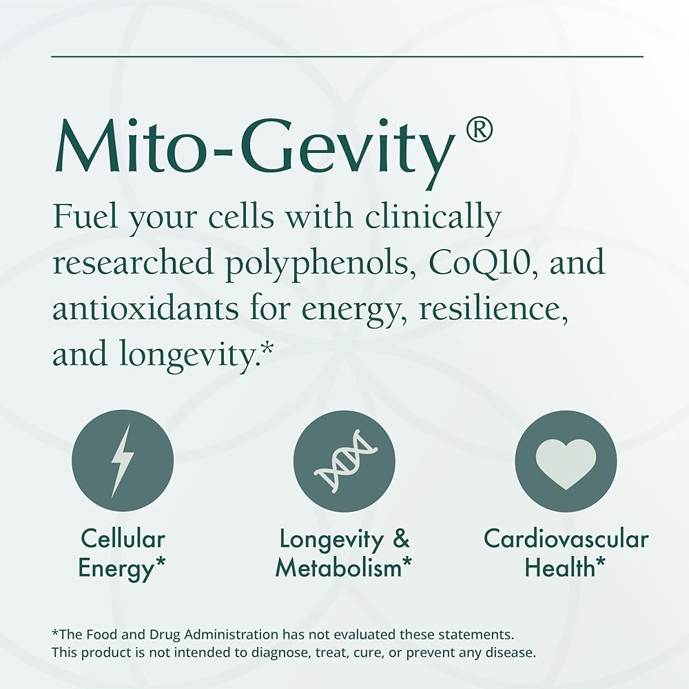 Mito-Gevity offers a variety of health benefits to encourage longevity and healthy aging. Its ingredients improve mitochondrial function, assist in the control of free radicals, modulate iimmune response function, and impart a redox-cycling effect (to reduce oxidative stress).