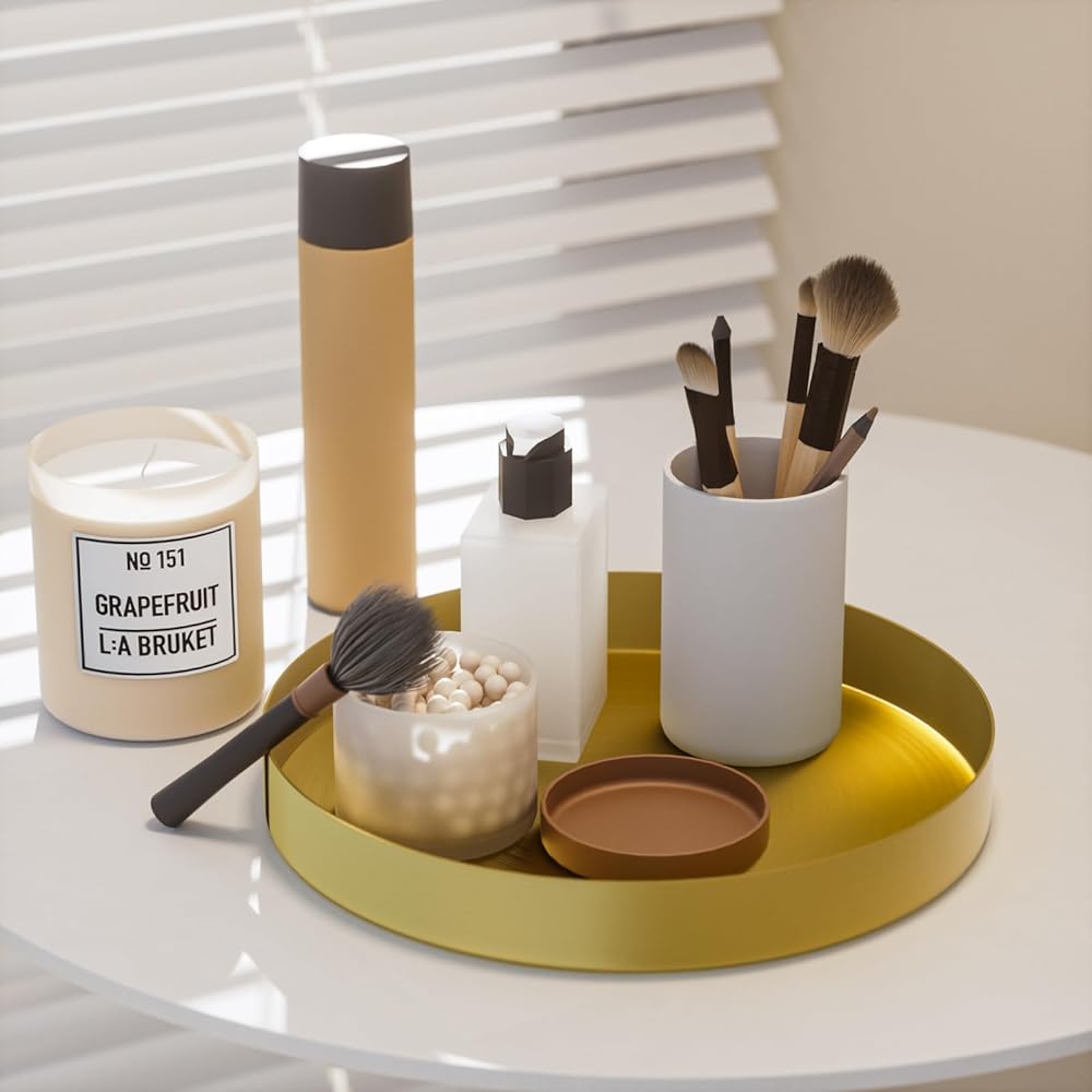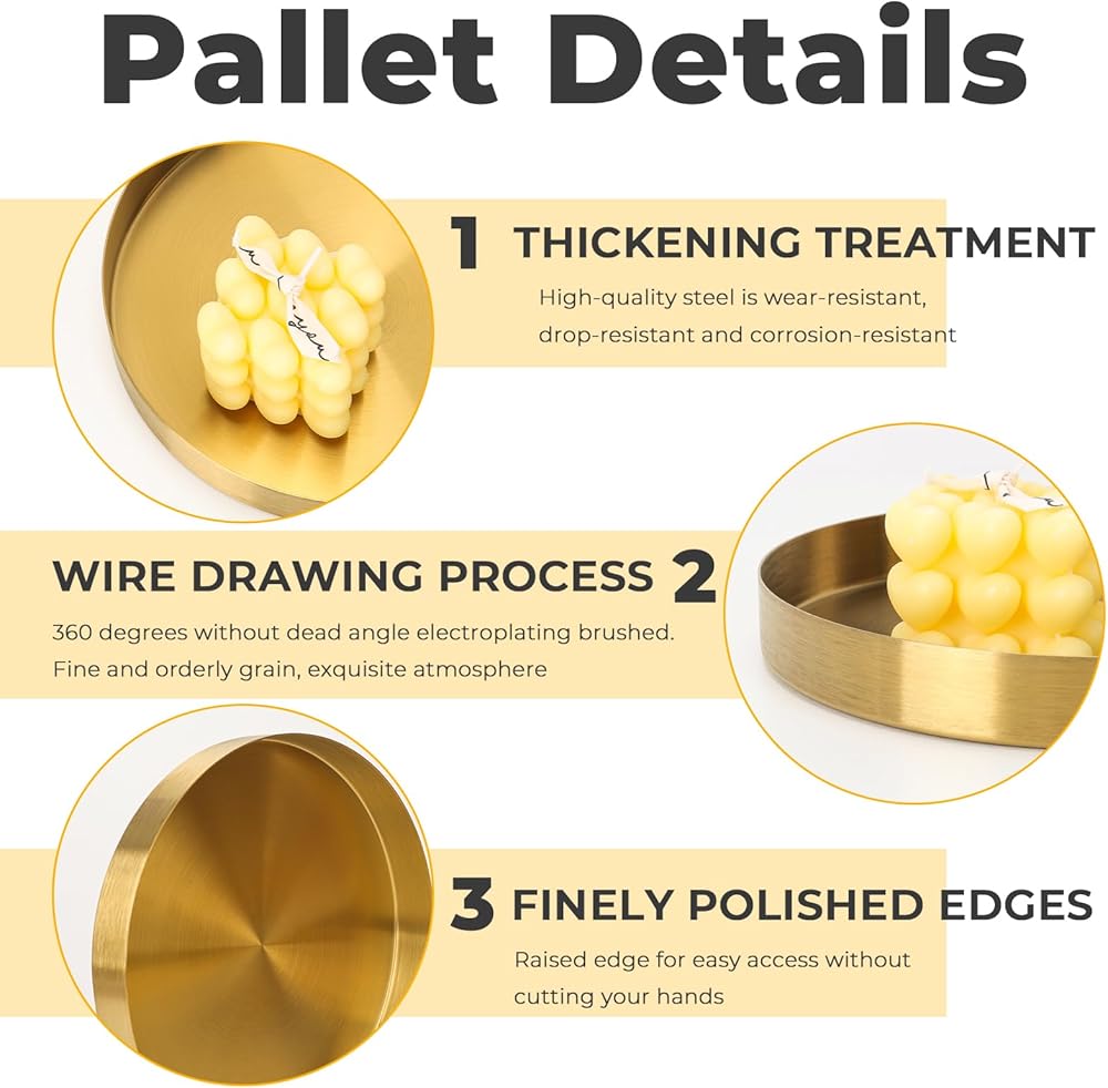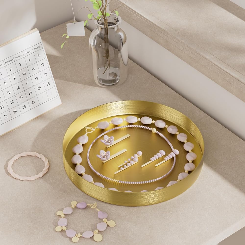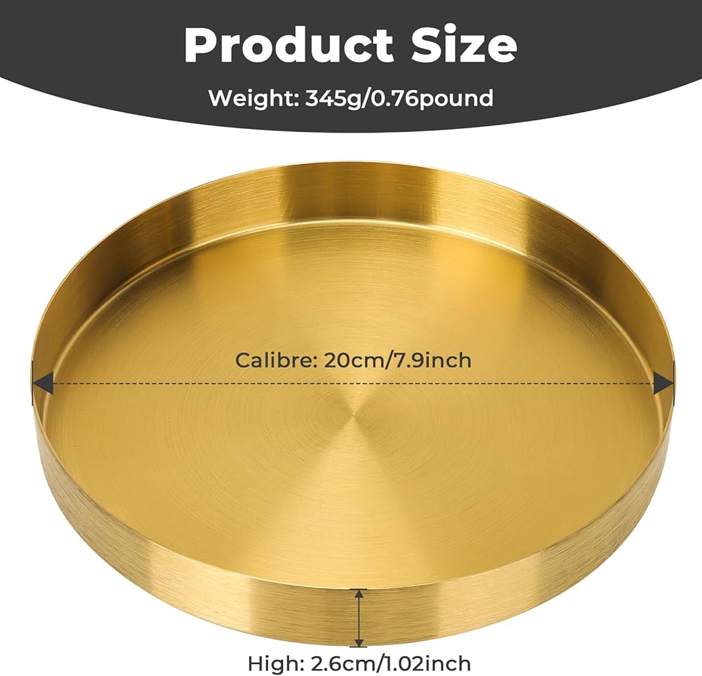 Strong Construction: The stylish and elegant tray size 7.9inch, weight 0.76pound. Made of thickened iron metal, sturdy, durable and super lightweight. The surface of round perfume tray is polished and has smooth edges and flat bottom, non-slip, anti-break and anti-scratch, which can better protect your countertop