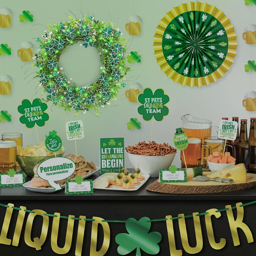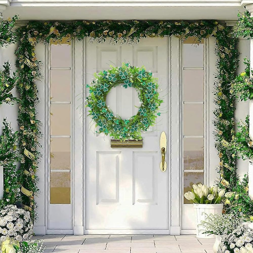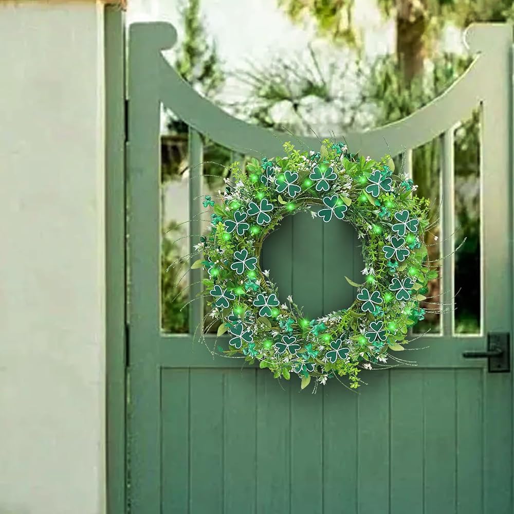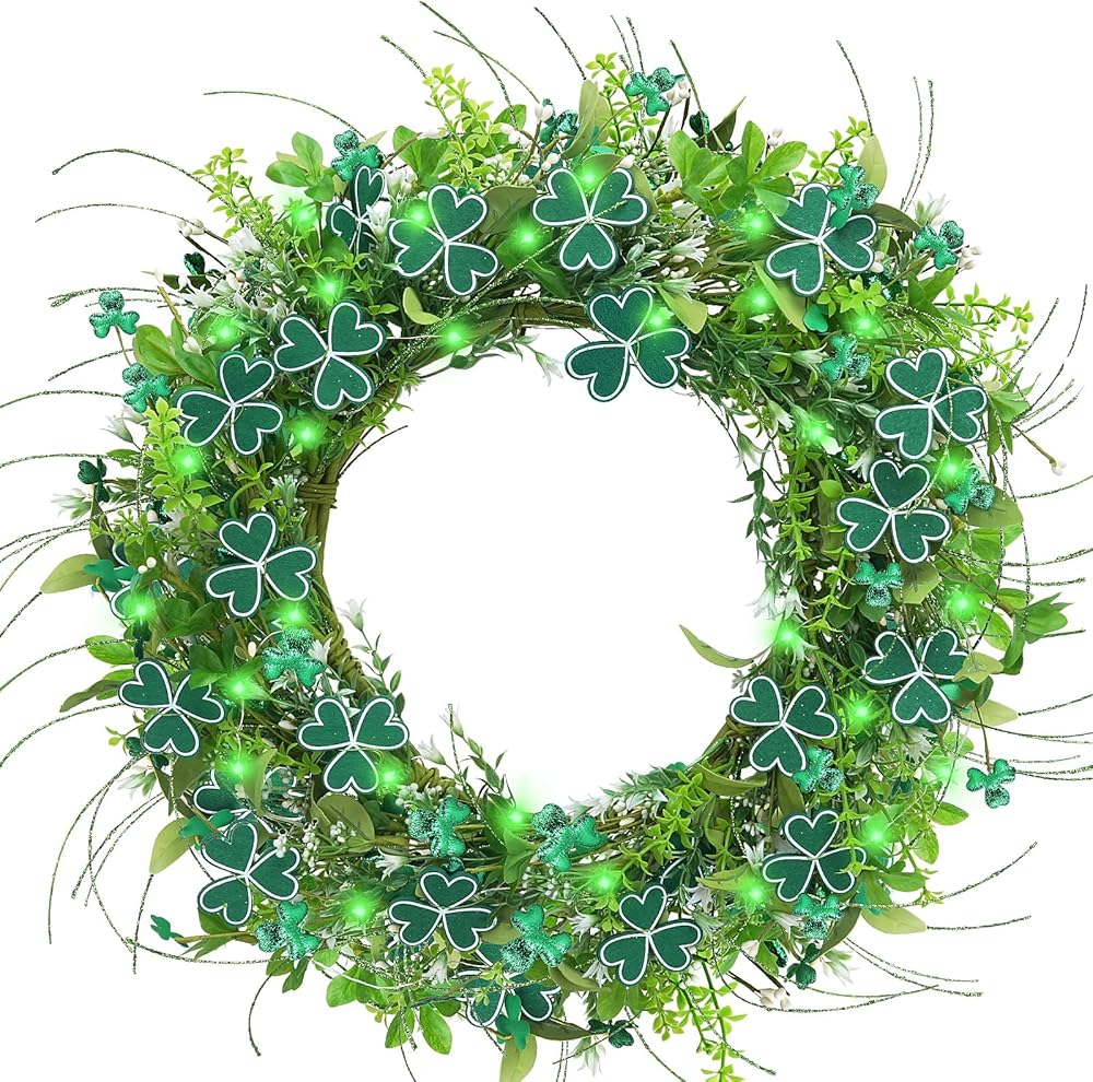 22" St. Patrick's Day Door Wreath Shamrock Decorations with 30 LED Lights Spring Wreaths for Front Door Wall Window Indoor and Outdoor Holiday Home Decor