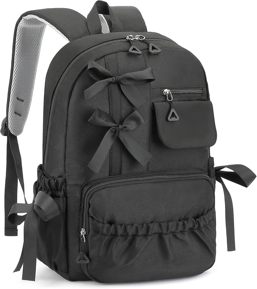 Multiple Pocket Design: This cute bow-not backpack measuring 13'' x 5.5'' x 17''. This aesthetic backpack has multiple functional pockets for organization. Included 1 main pocket with 2 small inner pockets for your small items and a protected divider for papers or laptop, 4 external front pockets, 1 hidden zipper back pocket and 2 side pocket for your water bottle