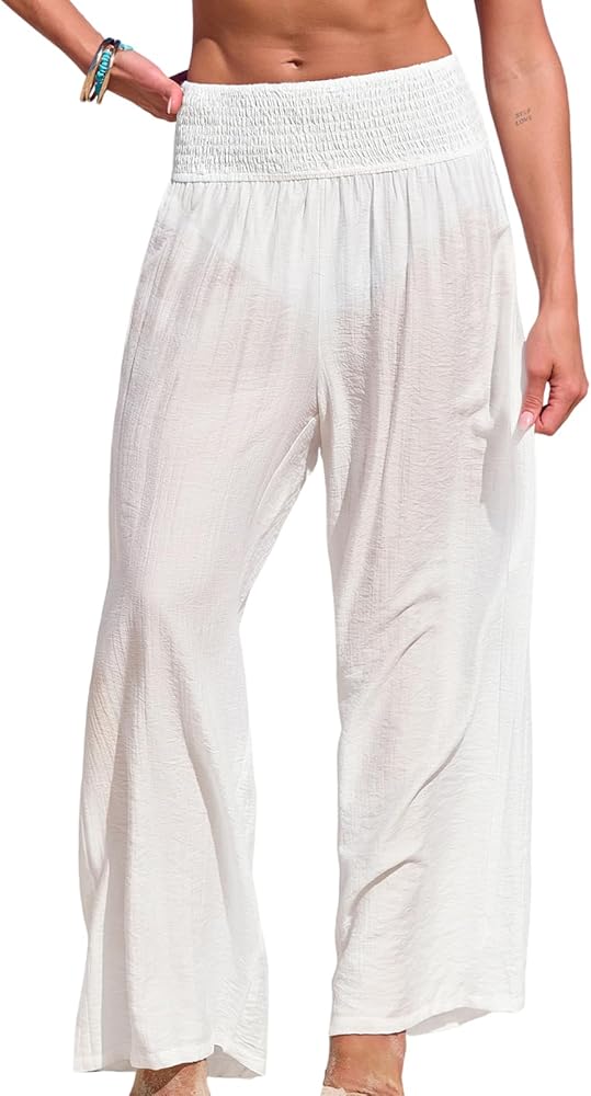 High Waist Beach Coverup Pants: Stay stylish and comfortable with these effortlessly chic smocked high-waisted lounge pants. These beach pants featuring a wide-leg design and a loose fit, are perfect for relaxed beach days or elegant casual outings