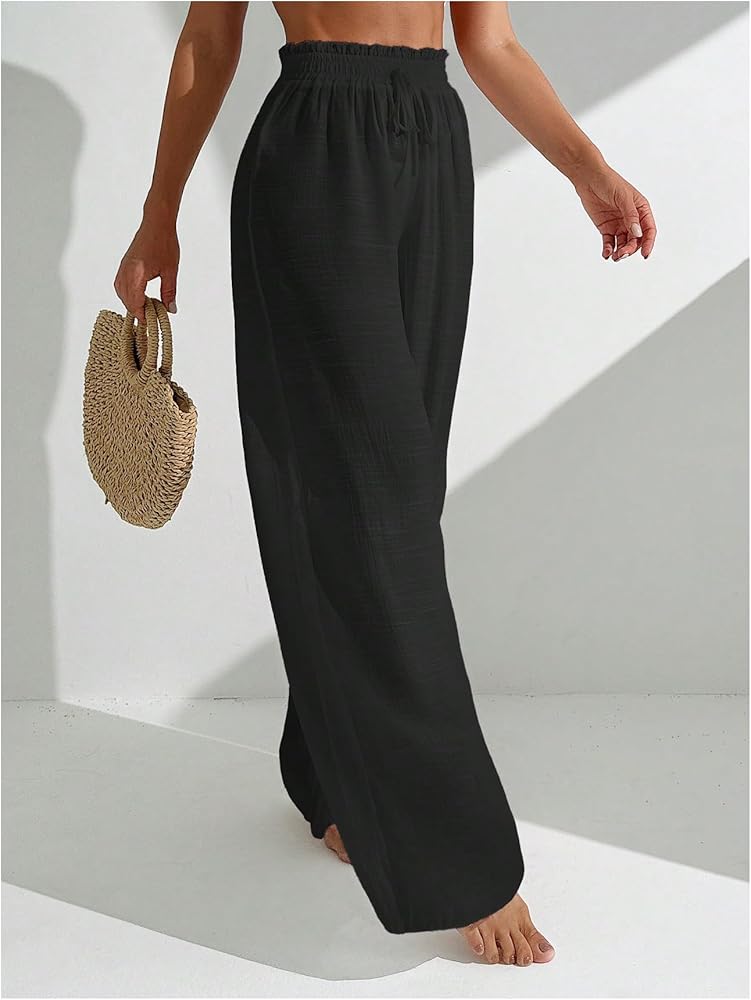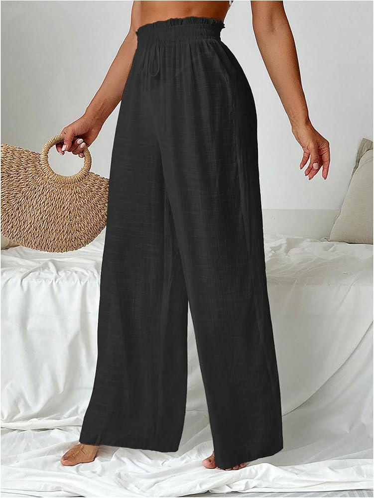 - Feature: Paperbag Waist, Decorative Drawstring, High Rise, Wide Leg, Long Pants, Loose Fit, Solid Beach Pants for Women