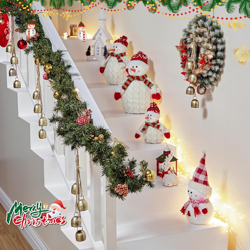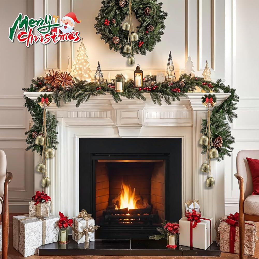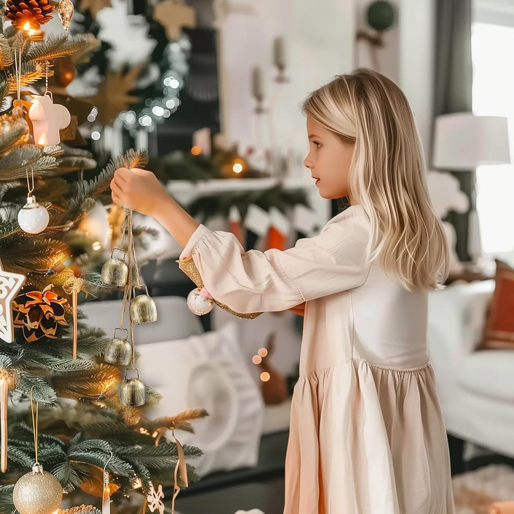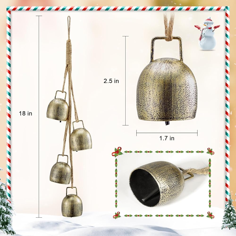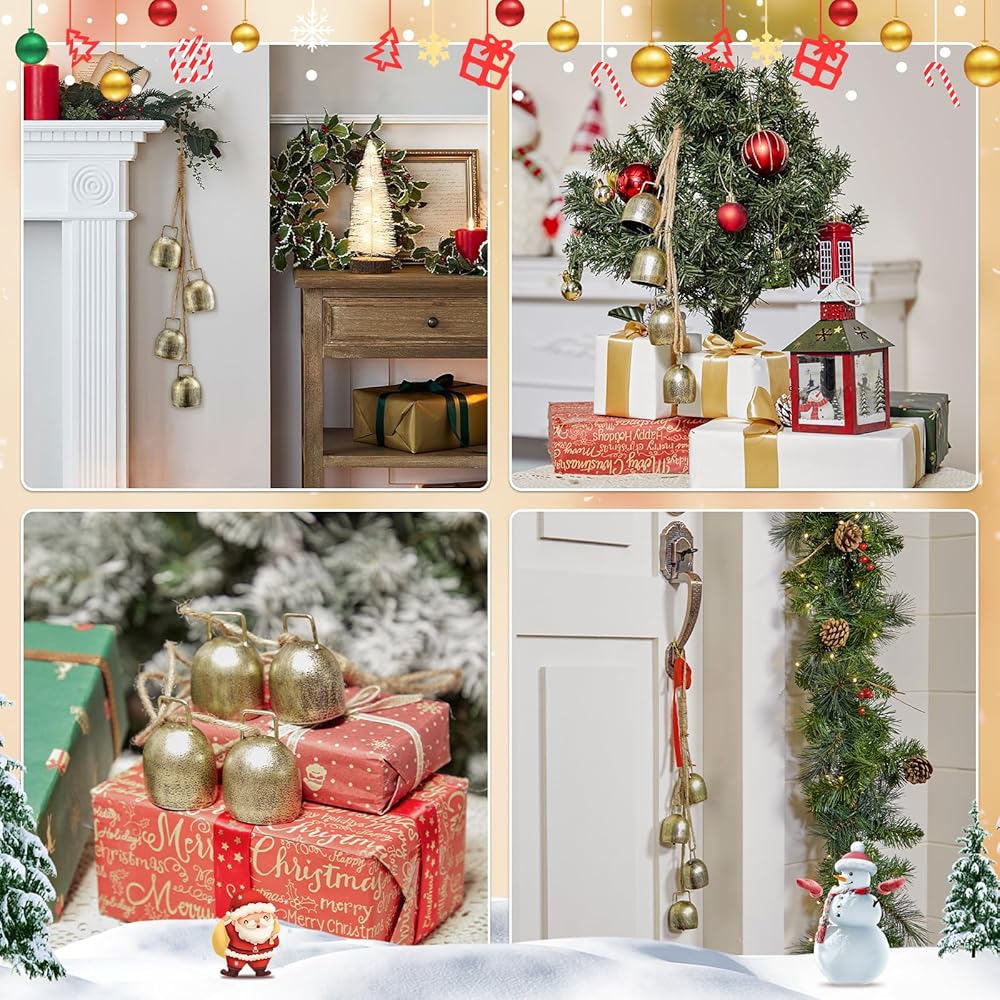 【 Christmas Bells 】- Rustic antique brass finish consisting of 4 cowbells. Top is tied with twine for easy placement. Christmas decorations for Christmas trees, Christmas wreaths, doors, and anywhere you need to decorate! Suitable for decorative Christmas bells, Christmas bells for doors, bell wreaths, Christmas tree bell ornaments.