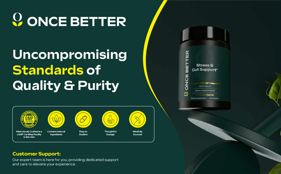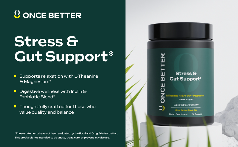 Once Better™️ Stress & Gut Support Supplement – Ashwagandha KSM-66®, L-Theanine, Magnesium Glycinate, Probiotics & Inulin for Digestive Health & Stress Relief – 60 Capsules - Men & Women