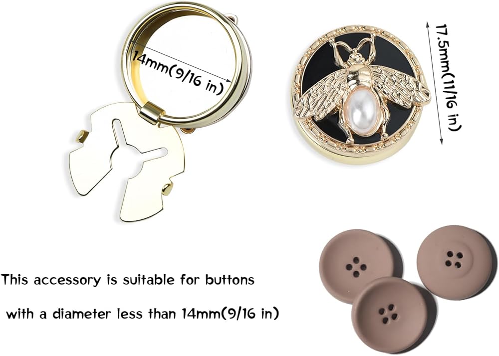 This bee button cover fits almost any standard shirt, just open the base, slide under the buttons and close..Suitable for buttons with a diameter less than 14 mm(9/16 in).