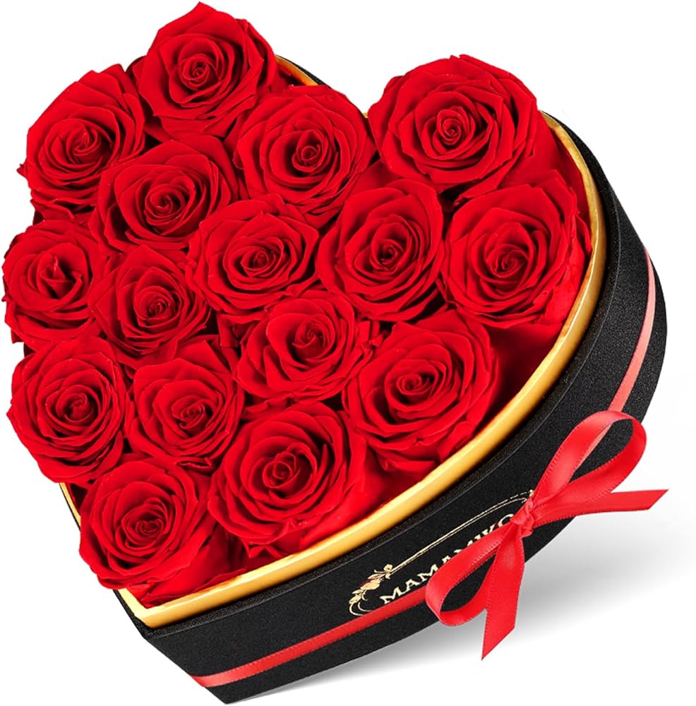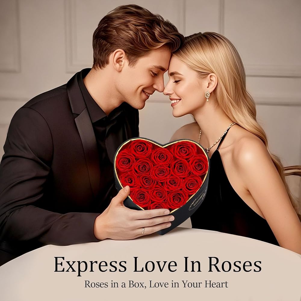 Luxurious Packaging: Each set includes 16 preserved roses arranged in a premium heart-shaped silk box(7.8 x 7.8 x 4.4 inches) with gold trim and a satin ribbon. A greeting card adds a personal touch, and the box is securely packaged to ensure safe delivery, making it an elegant gift for any occasion.
