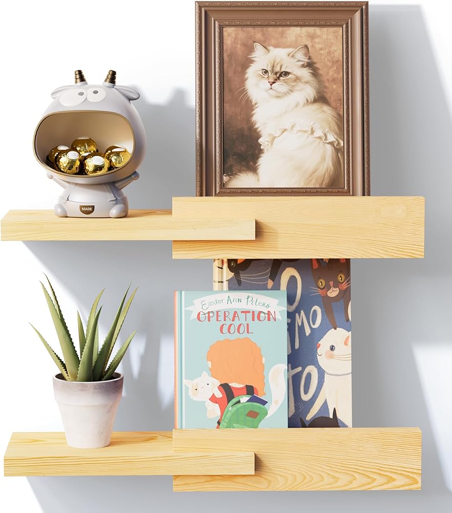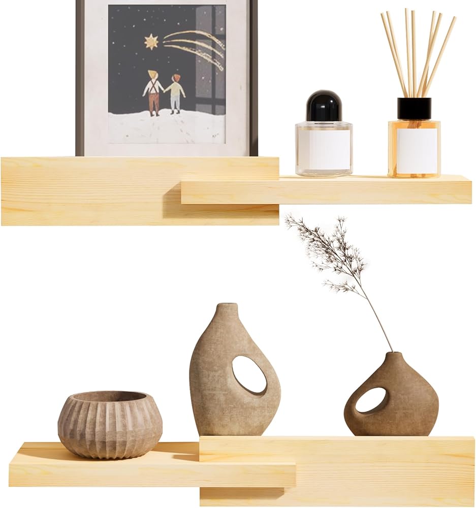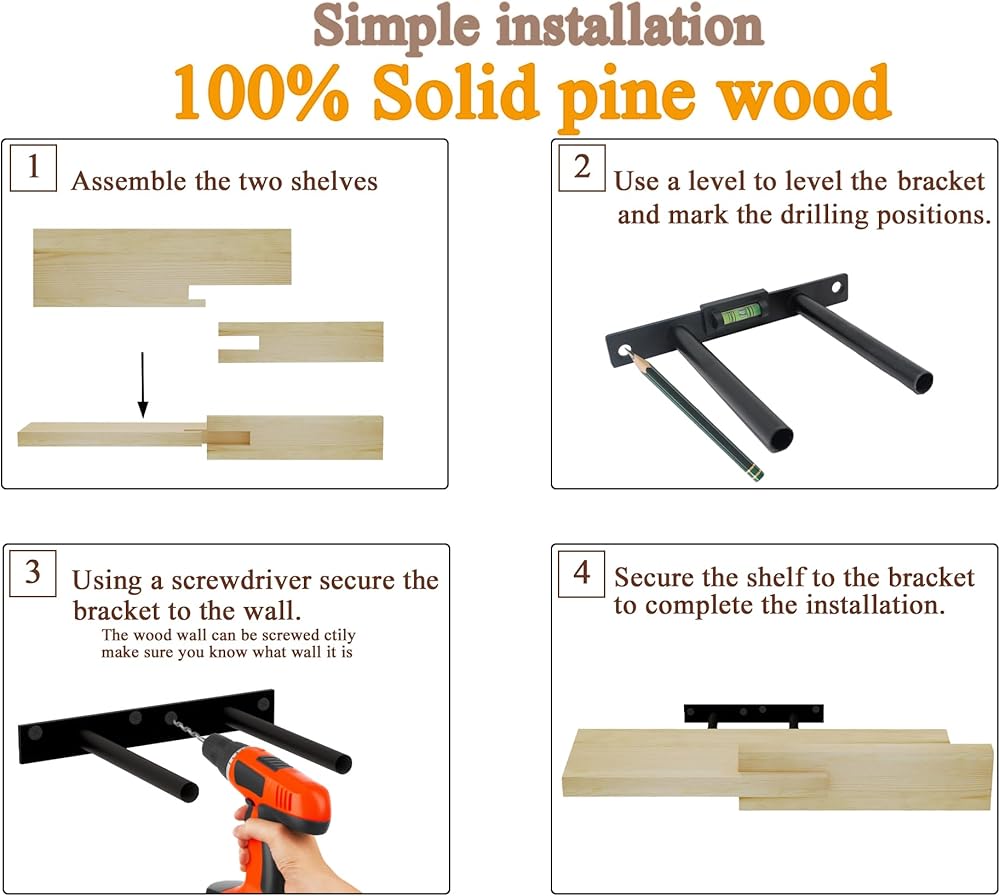 【High-Quality Materia & Multifunction】Wood floating shelves Crafted from 100% solid pine for enhanced durability. They're easy to clean,simply wipe them down to keep them looking bright and new. This set of 2 small shelves provide plenty of space for art, picture frames, books, records, DVDs, trophies, collectibles or small plants while blend perfectly with any style of home décor, which makes the ideal fit for your farmhouse modern bathroom, bedroom, kitchen and contemporary living room.