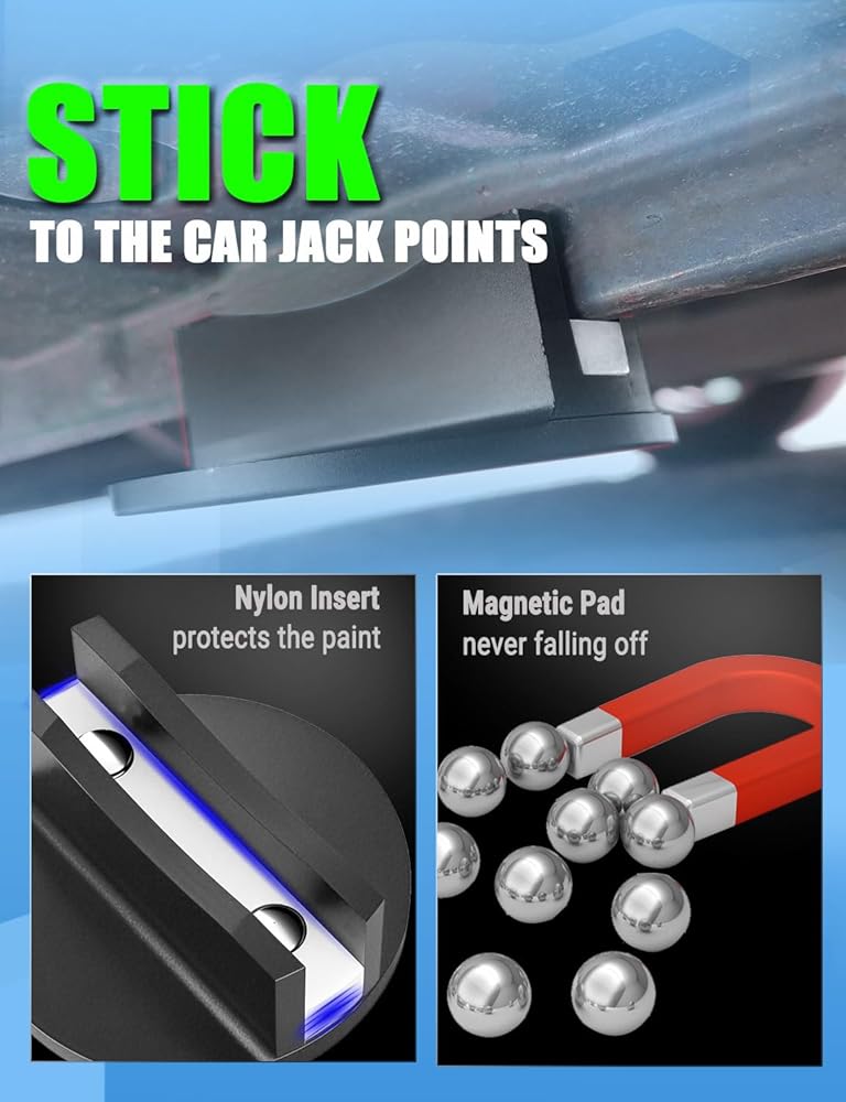 Hassle-Free Installation The car jack pad is easy to use.First, locate the correct jacking points on your vehicle. Then, simply place the magnetic side of the adapter flat against the pinch weld on the vehicle's body. After that, position your jack right underneath it. As you set the jack in place, the magnetic part will hold the adapter firmly in position, making the whole process quick and hassle - free