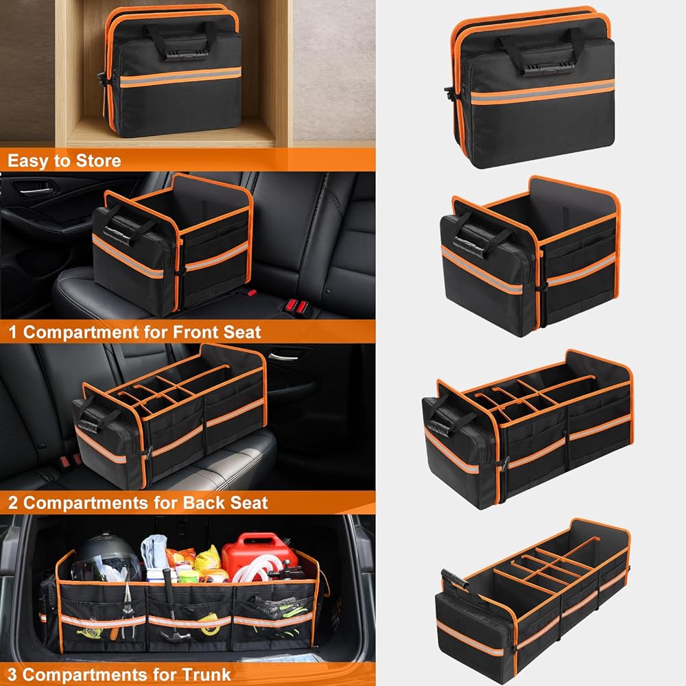 Sturdy & Long-lasting Materials: The car organizer is made of 1680D waterproof Oxford-fabric and 2.5mm thick PE boards which can support heavy loads without deformation. It resists wear, water damage, and stays sturdy over time. A reflective stripe enhances visibility in low light, making nighttime storage safer and more convenient
