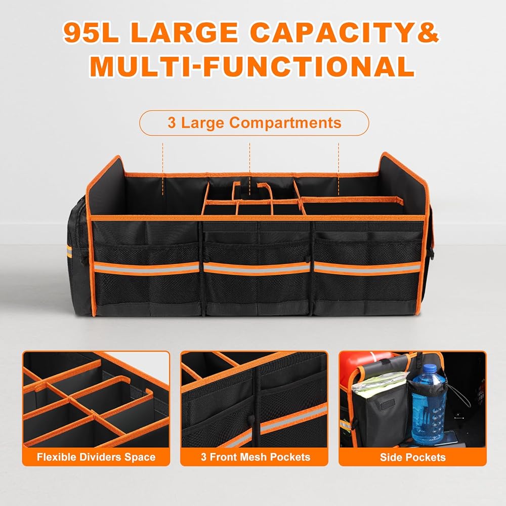 The car organizer offer a 95L large capacity and features 3 main compartments, 2 side pockets, and 3 large mesh pockets. Adjust dividers to fit tools, groceries, or emergency gear. Mesh pockets hold small items like keys or flashlights for quick access.
