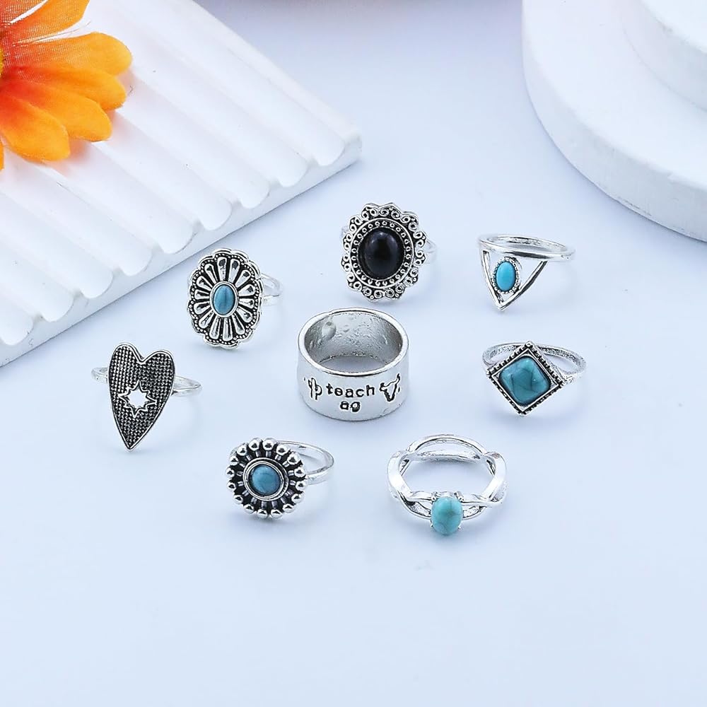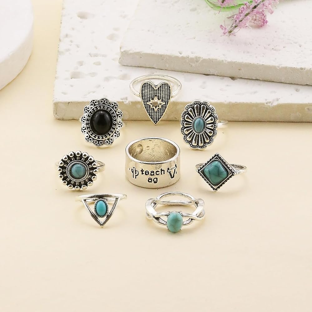 Turquoise Ring for Women Bohemian Stackable Knuckle Rings Set Boho Turquoise Finger Ring Vintage Oval Flower Starfish Teardrop Midi Snake Ring Western Rings Jewelry