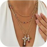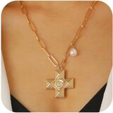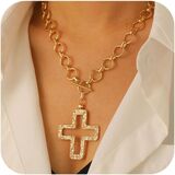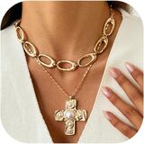 Gold Chunky Cross Necklace for Women Statement Necklace Pearl Cross Pendant Necklace Layered Hammered Bold Cross Necklace Vintage Toggle Clasp Necklace Jewelry