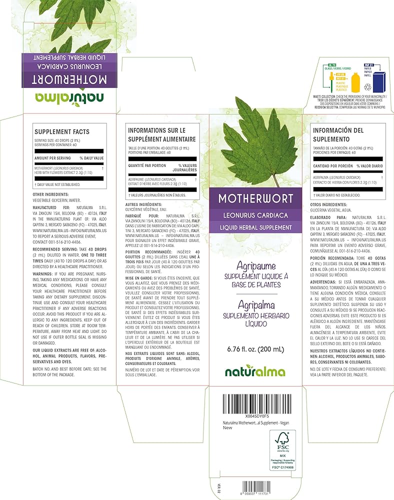 Motherwort (Leonurus cardiaca) herb with flowers Liquid herbal supplement in drops, consisting of a concentrated liquid extract (tincture 1:10), highly pure and 100% natural. All NATURALMA liquid extract or tinctures are made using an exclusive extraction method, which allows to obtain the maximum concentration of active ingredients. They are 100% alcohol-free and totally natural. Pleasant-tasting and without added sugar. Our herbal supplement are produced and packaged in Italy. Our liquid extract are free of: Alcohol, Animal products, Flavors, Preservatives and Colors. Glycerine is a 100% natural, plant-based and low calorie sweetener. Glyceric macerate or pure fluid extract of Motherwort (Leonurus cardiaca) herb with flowers in drops.